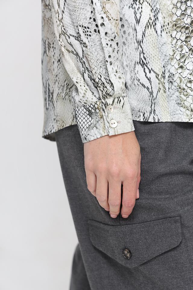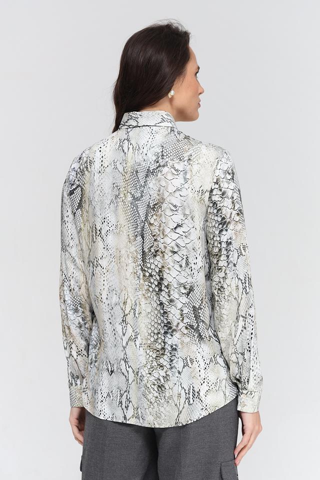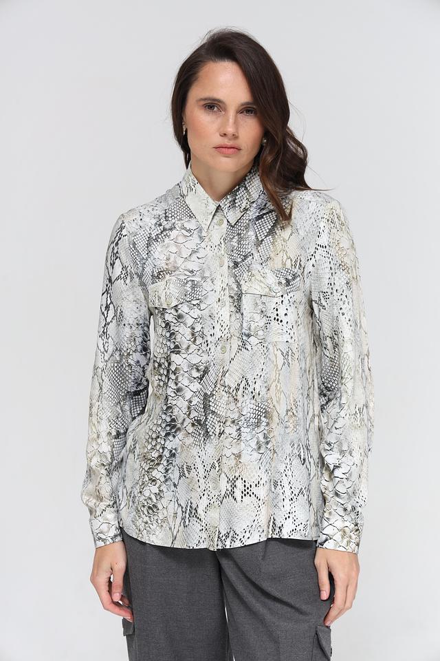 Эта блуза от Bianca выполнена из 100% вискозы, что делает ее легкой, дышащей и приятной к телу. Особенностью модели является эффектный принт, имитирующий змеиную кожу в бежевых и серых тонах.