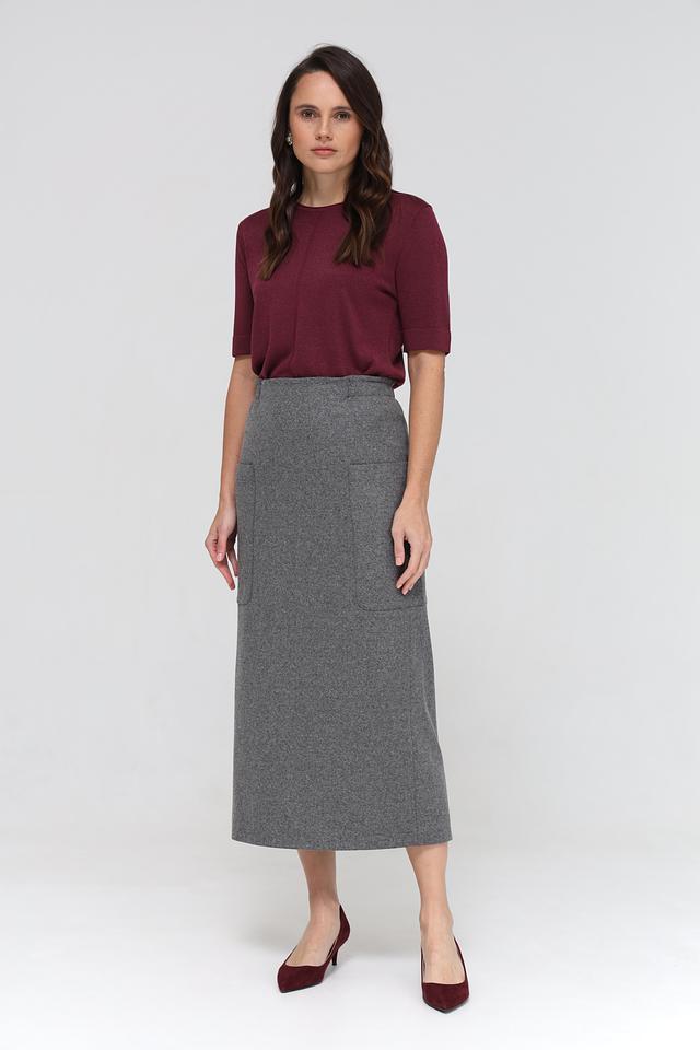 Модель имеет прямой крой, короткие рукава и круглый вырез горловины. Вертикальный шов спереди визуально вытягивает силуэт и добавляет оригинальности. Пуловер изготовлен из высококачественной вискозы с добавлением металлизированной нити, благодаря чему он приятен к телу, хорошо драпируется и обладает легким блеском.