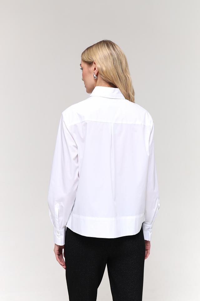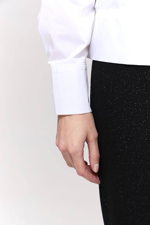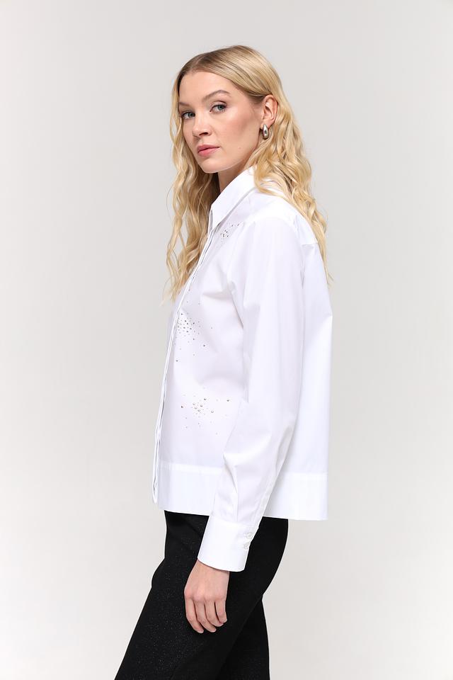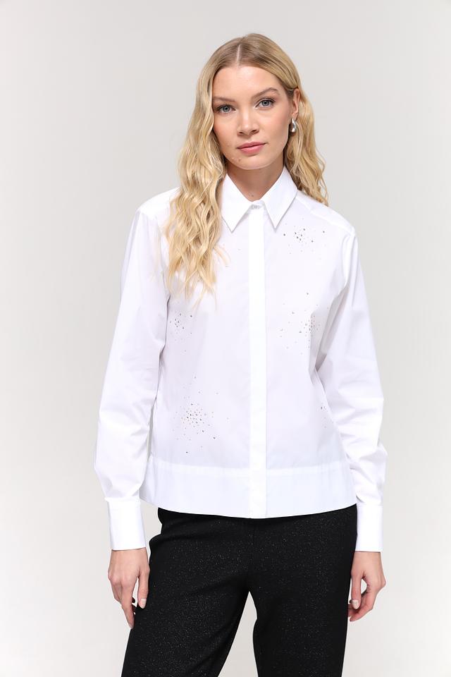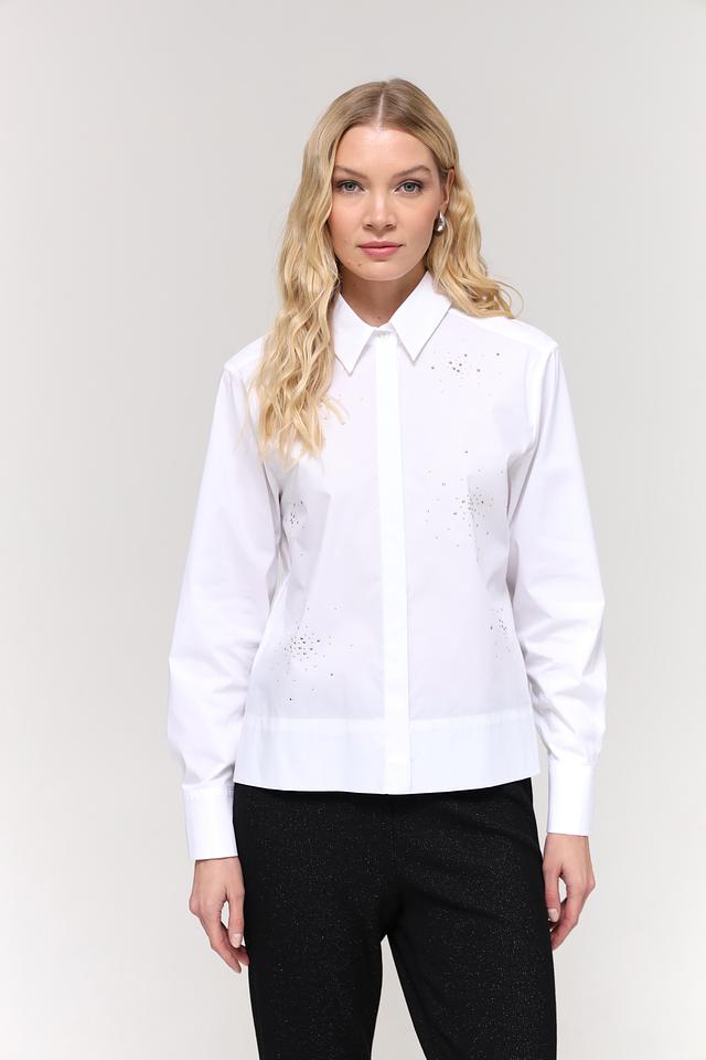 Белая рубашка Bianca с длинным рукавом, украшенная деликатным декором из страз. Классический крой и качественный состав ткани делают эту модель универсальным элементом гардероба. Состав: хлопок 58%, полиамид 37%, эластан 5%
