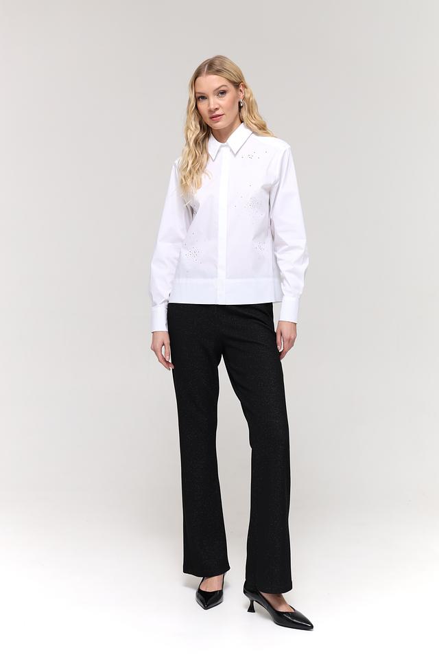 Особенностью данной модели является деликатный декор из страз, расположенный на передней части. Это придает рубашке изысканность и привлекает внимание к верхней части тела. Рубашка имеет длинные рукава и классический воротник.