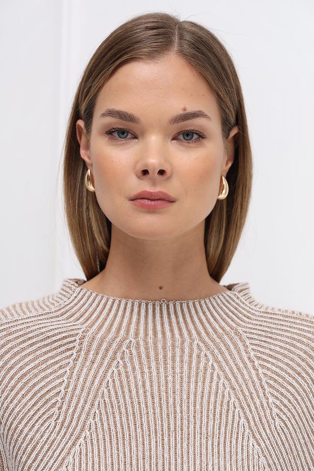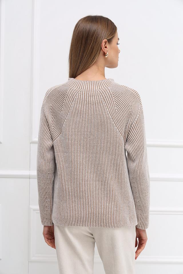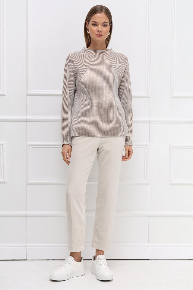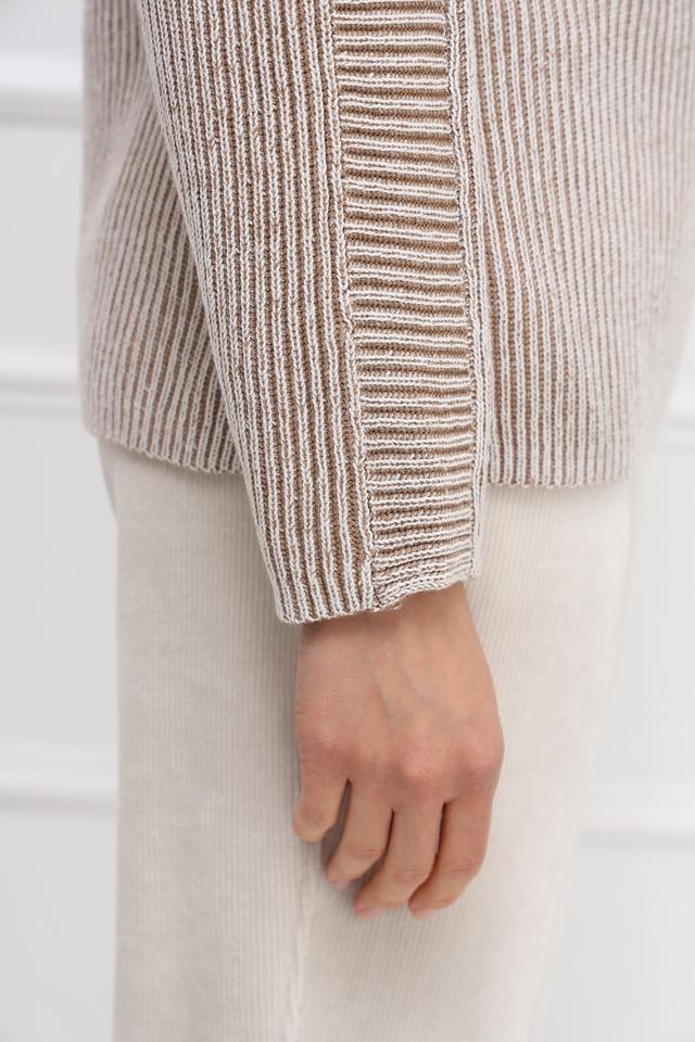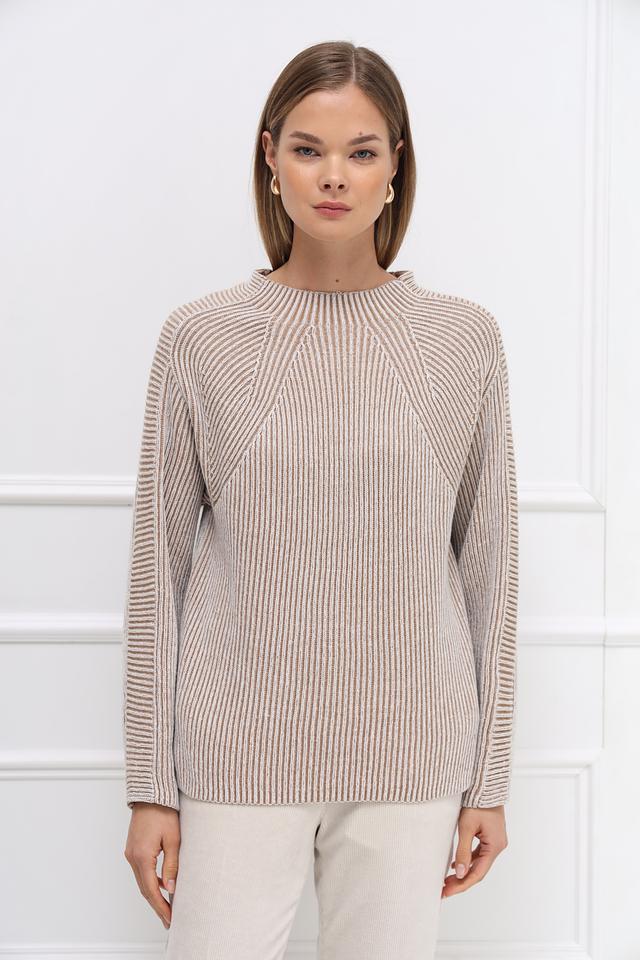 Пуловер имеет приятную текстуру благодаря вертикальной полосатой вязке, выполненной в бежевых и светло-коричневых тонах. Небольшой воротник-стойка добавляет изысканности, а свободный крой обеспечивает свободу движений.