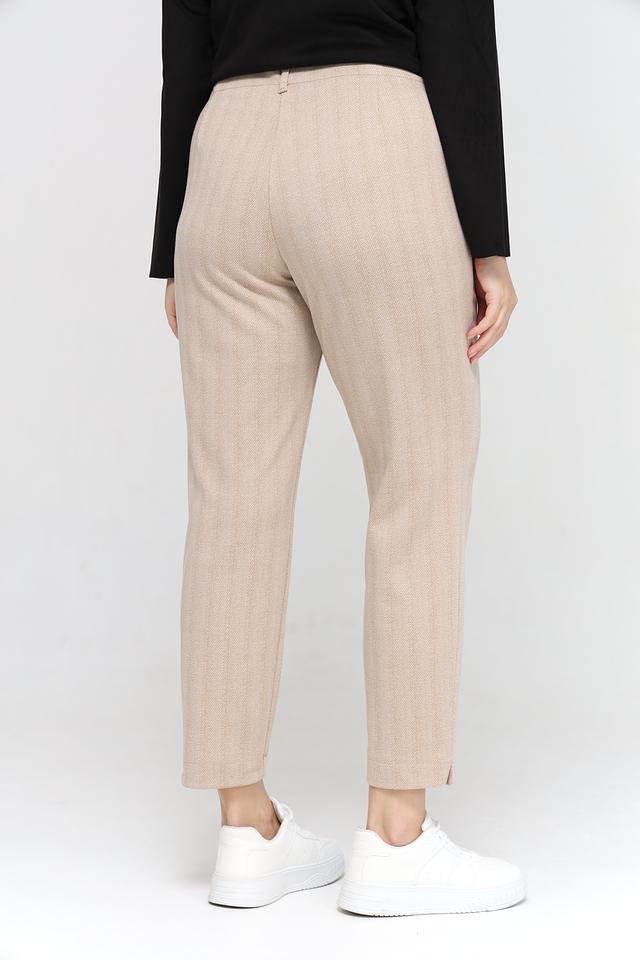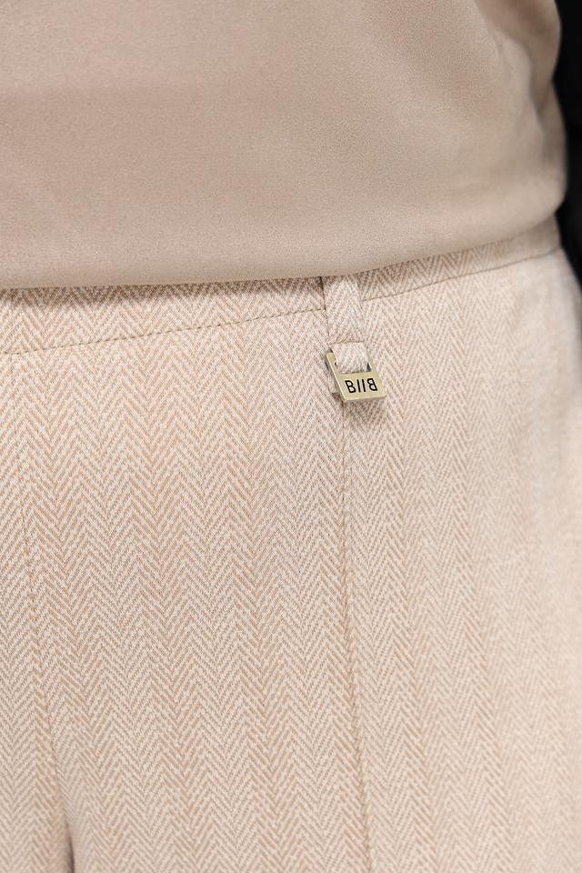 Брюки имеют прямой крой и высокую посадку, что обеспечивает комфортную посадку по фигуре. Ткань с текстурированным рисунком "в ёлочку" придает изделию элегантный и изысканный вид. Удобный эластичный пояс обеспечивает свободу движений и комфорт в течение всего дня.