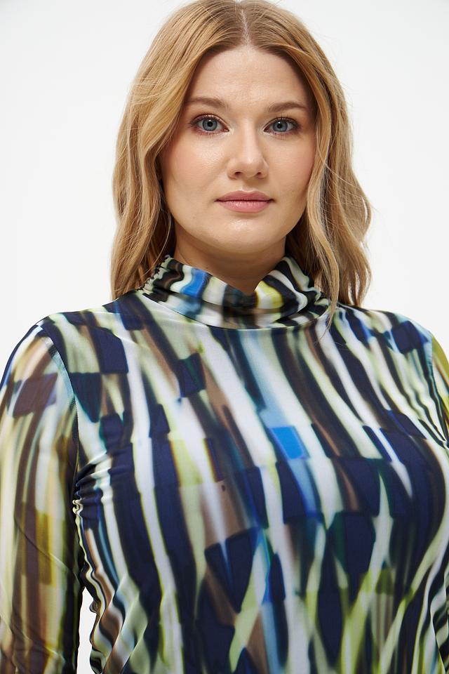 Особенностью данной модели является оригинальный абстрактный принт, выполненный в сочетании синих, зеленых и желтых оттенков. Блуза имеет длинные рукава и высокий воротник-стойку, что придает ей элегантный и современный вид.