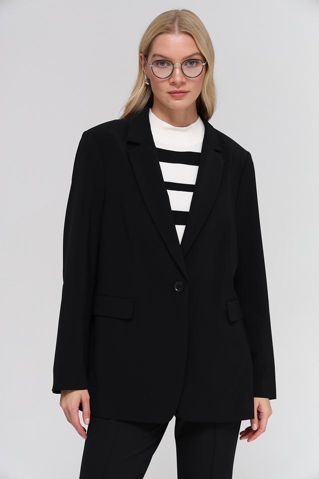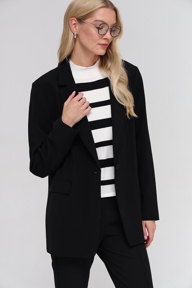 Чёрный жакет Bianca оверсайз кроя станет стильным дополнением к вашему гардеробу. Модель выполнена из полиэстера с добавлением эластана, что обеспечивает комфорт и свободу движений. Жакет имеет классический лацкан и застёжку на одну пуговицу. Состав: полиэстер 91%, эластан 9%