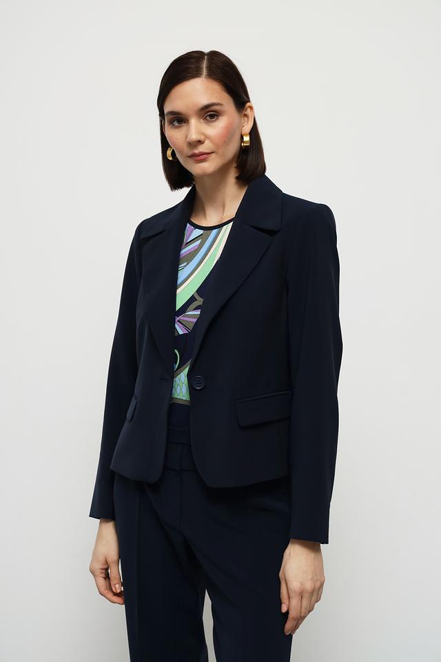 Этот стильный жакет от Bianca выполнен в классическом тёмно-синем цвете. Прямой крой и приталенный силуэт подчеркивают фигуру, создавая элегантный образ.