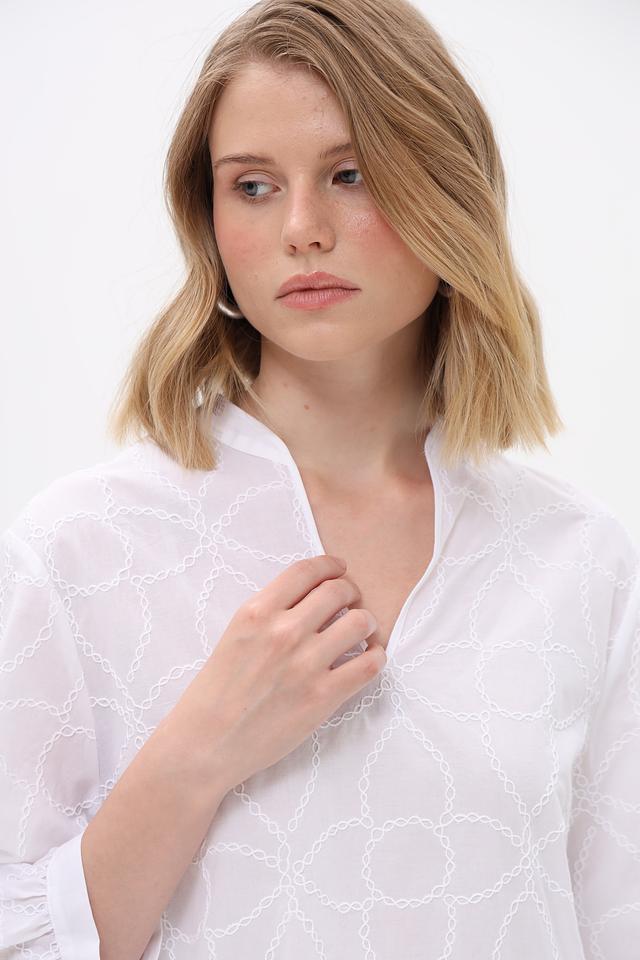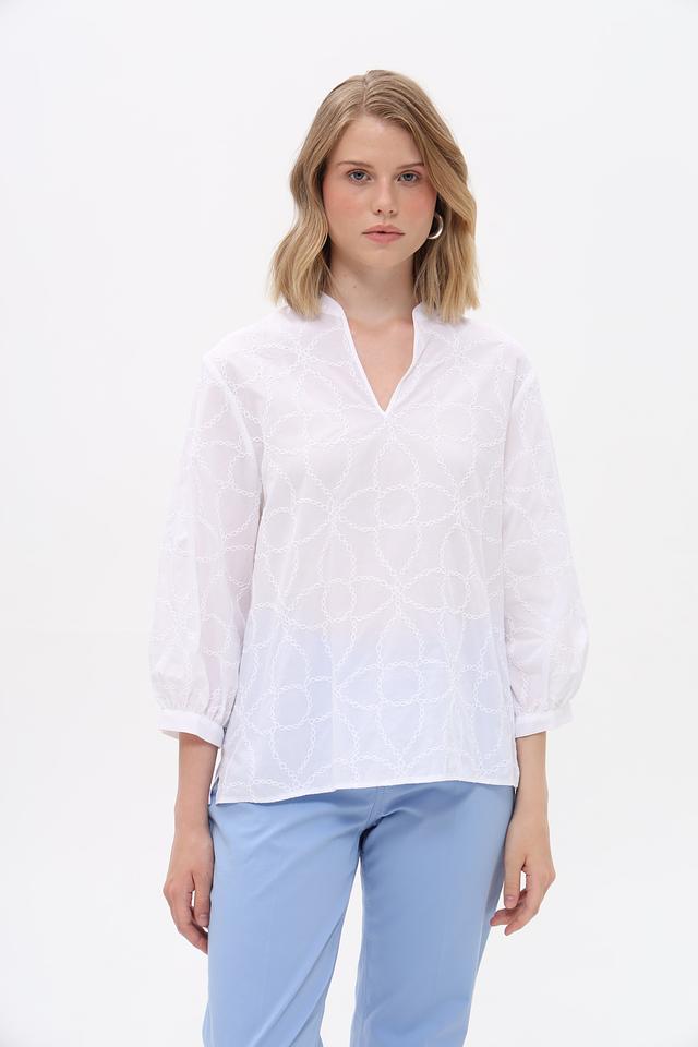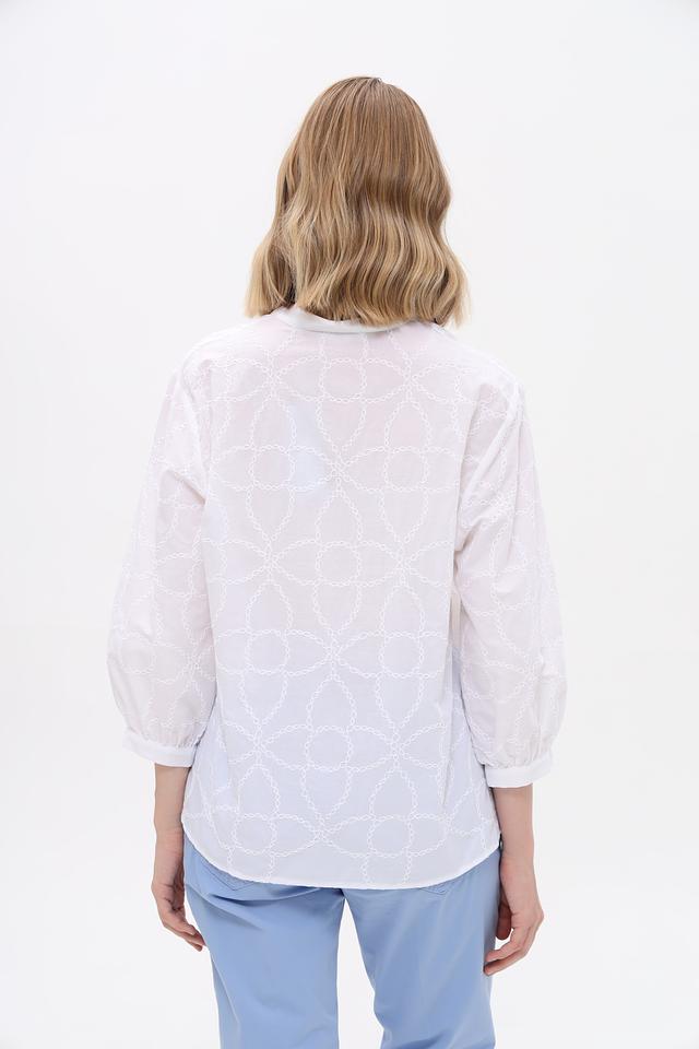 Белая блуза Bianca с изысканной вышивкой в виде геометрического узора станет отличным дополнением к вашему гардеробу. Модель выполнена из 100% хлопка, что обеспечивает комфорт и воздухопроницаемость. Состав: хлопок 100%
