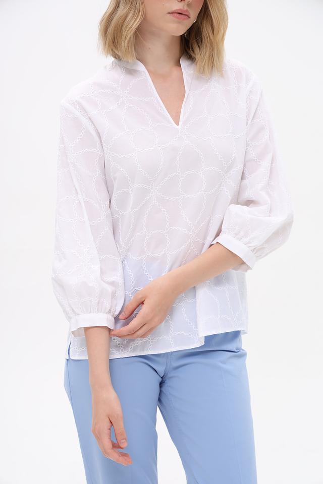 Особенностью данной модели является изысканная вышивка, выполненная в виде геометрического узора. Вышивка придает блузе элегантный и утонченный вид. Блуза имеет V-образный вырез горловины и рукава 3/4 с небольшими сборками на манжетах, что придает им объем и воздушность.