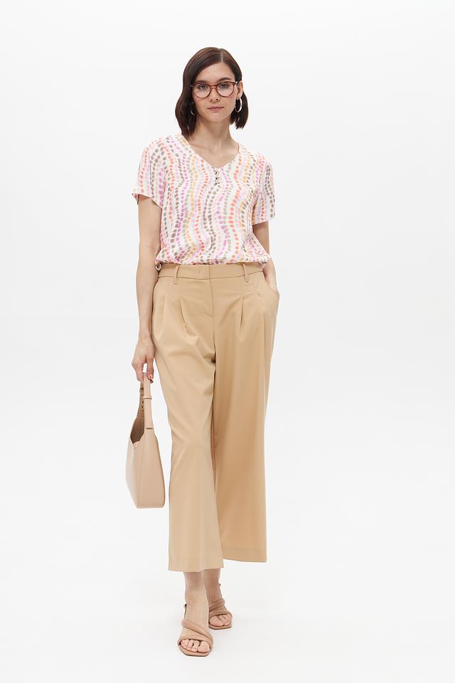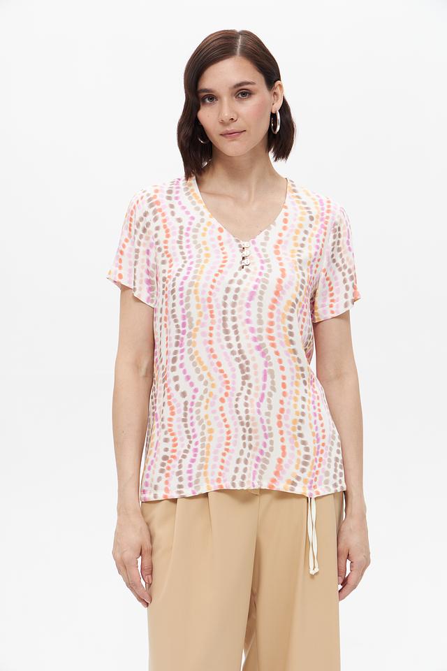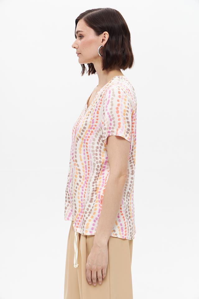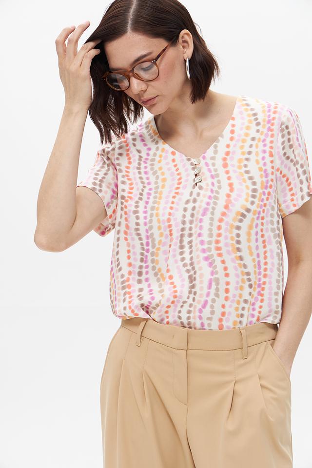 Блуза имеет свободный крой, который обеспечивает комфорт в носке. V-образный вырез подчеркивает линию шеи, а короткие рукава делают ее идеальным выбором для теплой погоды. Особенностью данной модели является яркий и необычный принт, выполненный в пастельных тонах.
