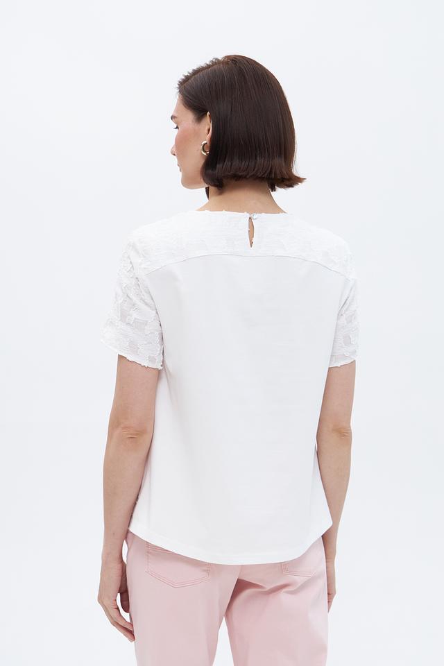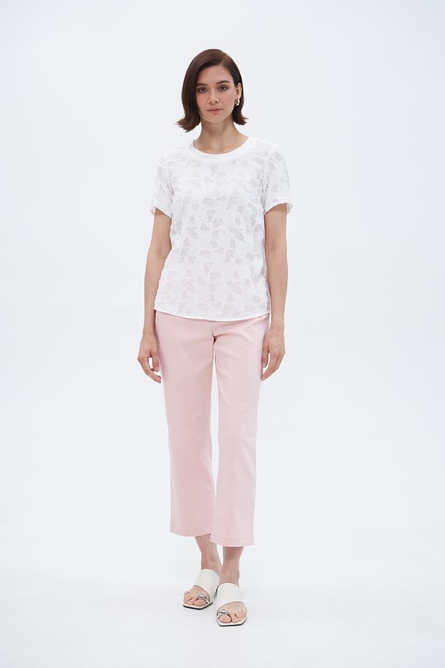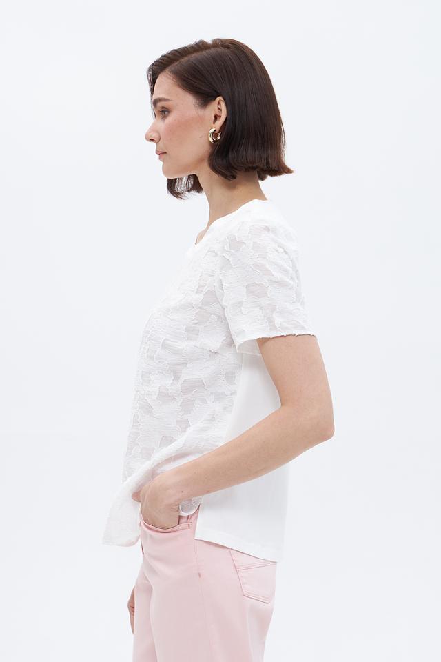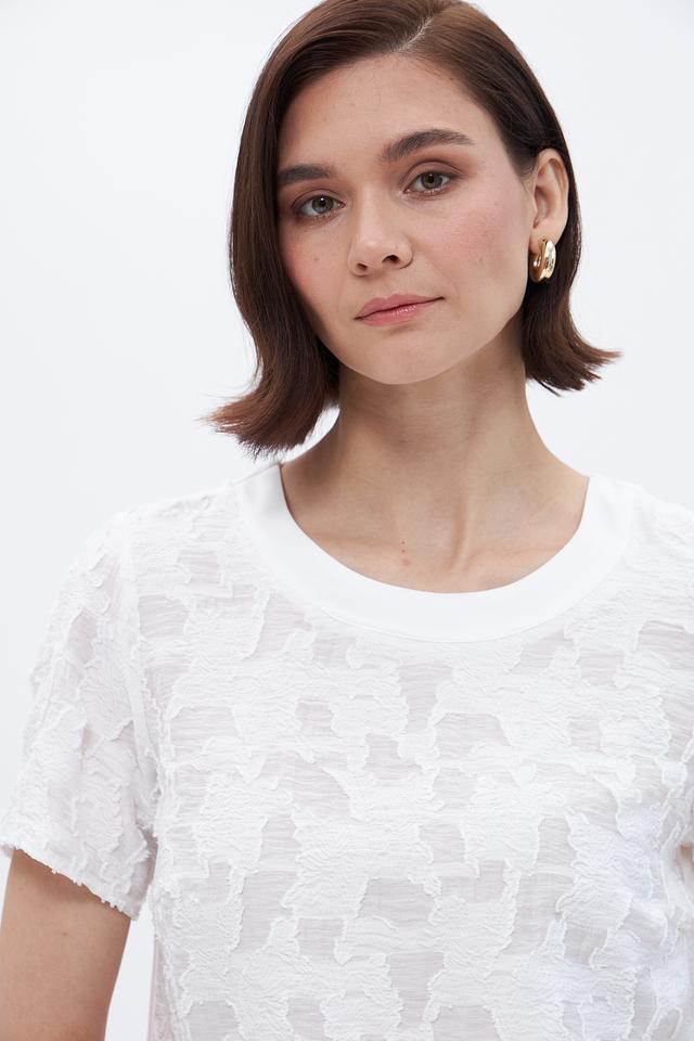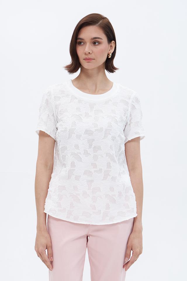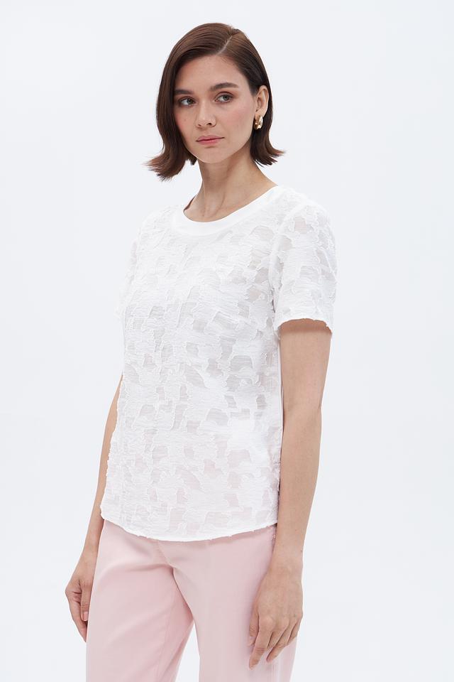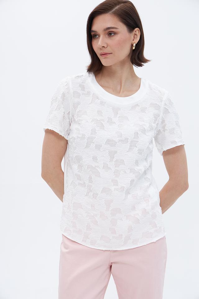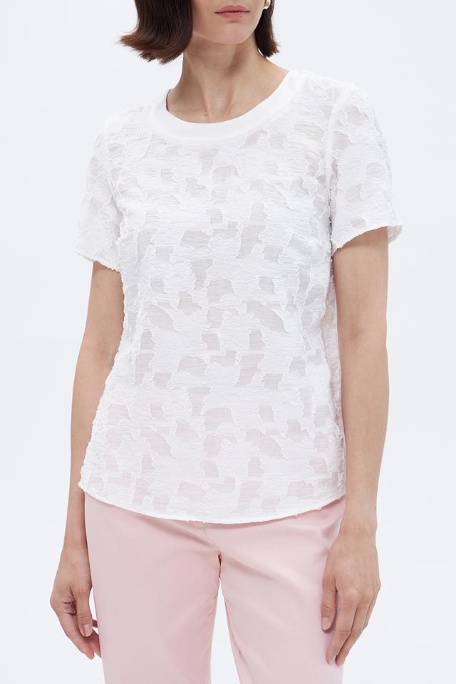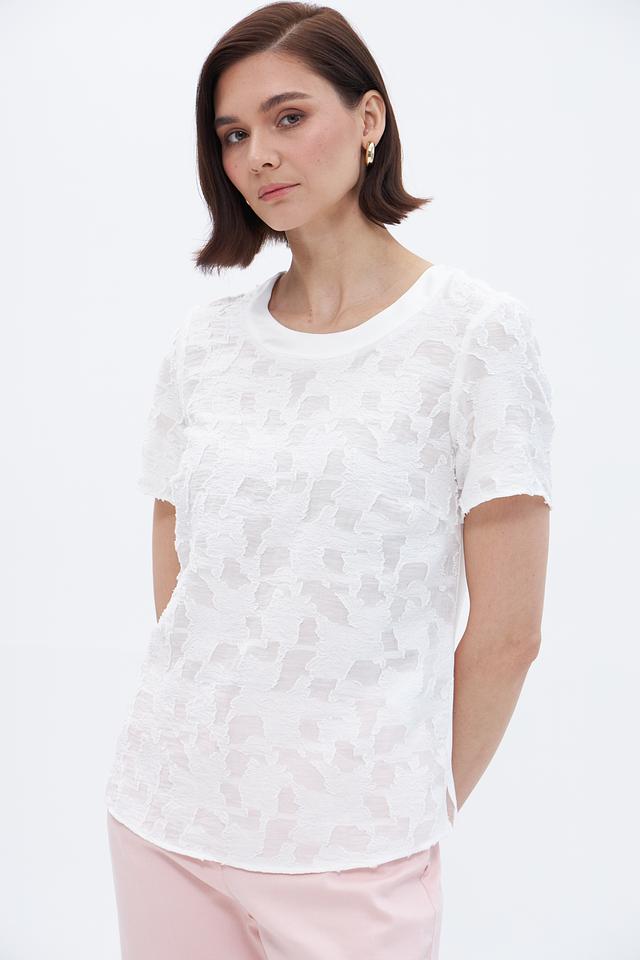 Модель имеет прямой силуэт, короткие рукава и круглый вырез горловины. Блузка украшена деликатным цветочным принтом на белом фоне, что придает ей женственности и романтичности.