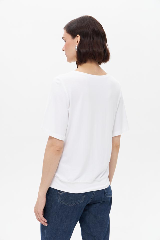 Футболка имеет прямой крой, короткие рукава и круглый вырез горловины. Она идеально подходит для создания повседневных образов в сочетании с джинсами, шортами или юбками. Состав: 92% вискоза, 8% эластан.