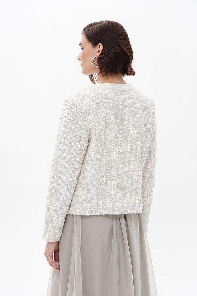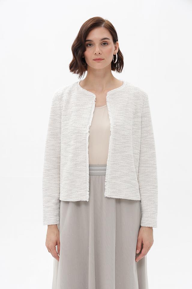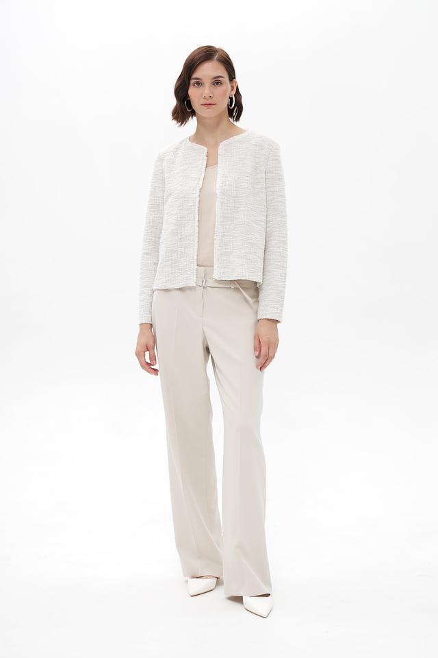 Бежевый жакет Bianca выполнен из твидовой ткани с добавлением металлизированной нити. Модель имеет короткий крой и округлый вырез горловины, отделанный бахромой. Жакет станет стильным дополнением к вашему образу. Состав: полиэстер 58%, хлопок 34%, метализ.нить 6%, эластан 2%