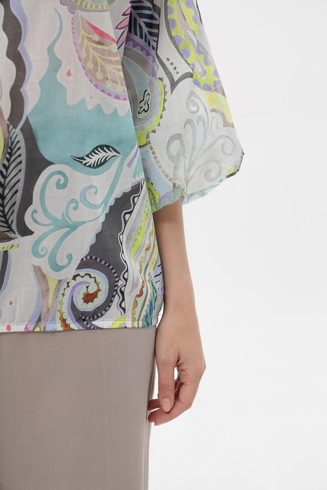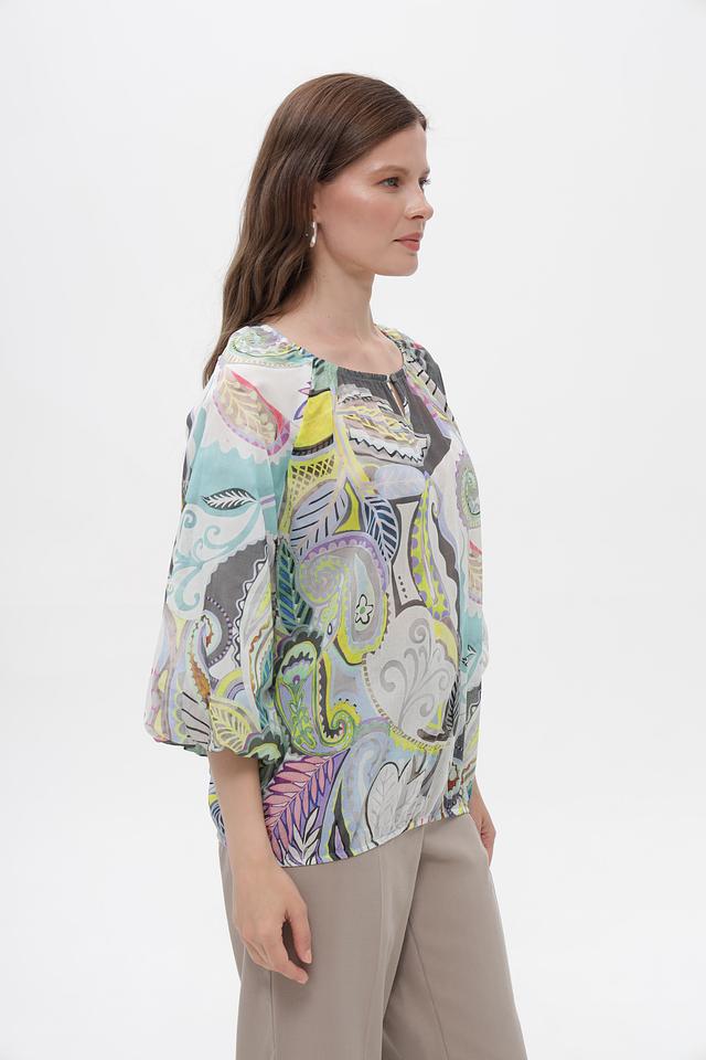 Модель имеет свободный крой, который не сковывает движения, и рукава длиной 3/4. Особенность блузки – эффектный принт пейсли в мятной, серой, зелёной, жёлтой и розовой цветовой гамме. Круглый вырез горловины.