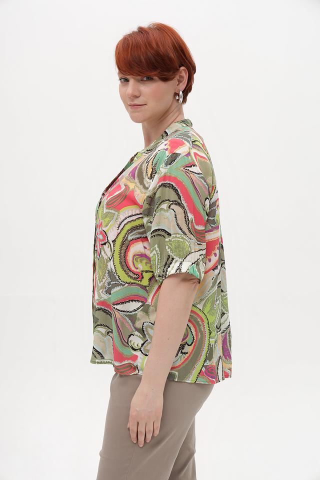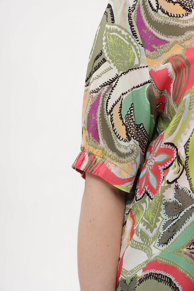 Блуза имеет яркий и красочный цветочный принт, который добавляет ей женственности и оригинальности. V-образный вырез подчеркивает линию шеи, а короткие рукава делают ее идеальной для теплой погоды.
