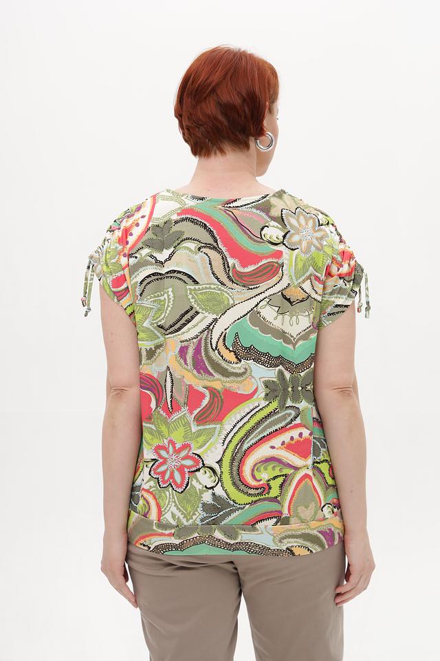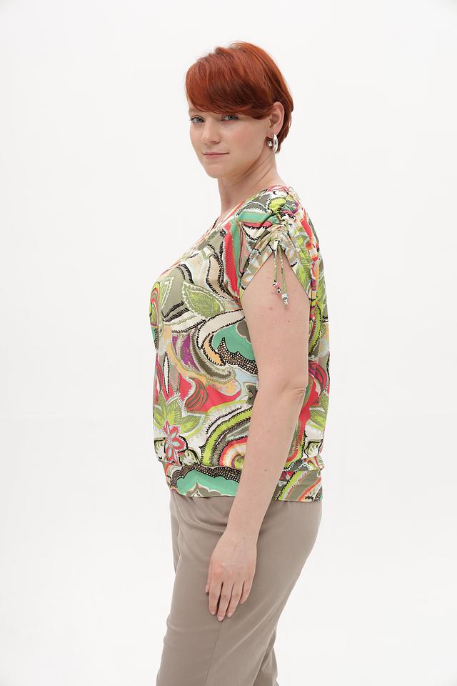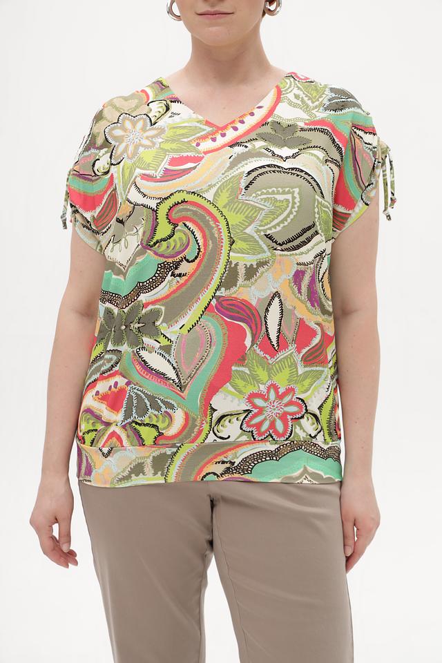 Основной цвет блузы – зеленый, но она украшена ярким и красочным цветочным принтом, включающим в себя оттенки красного, розового, оранжевого и бежевого. Такой рисунок делает эту блузу уникальной и привлекательной.