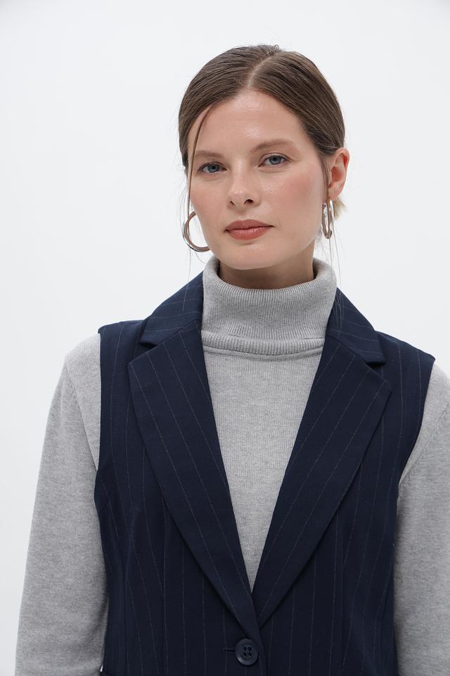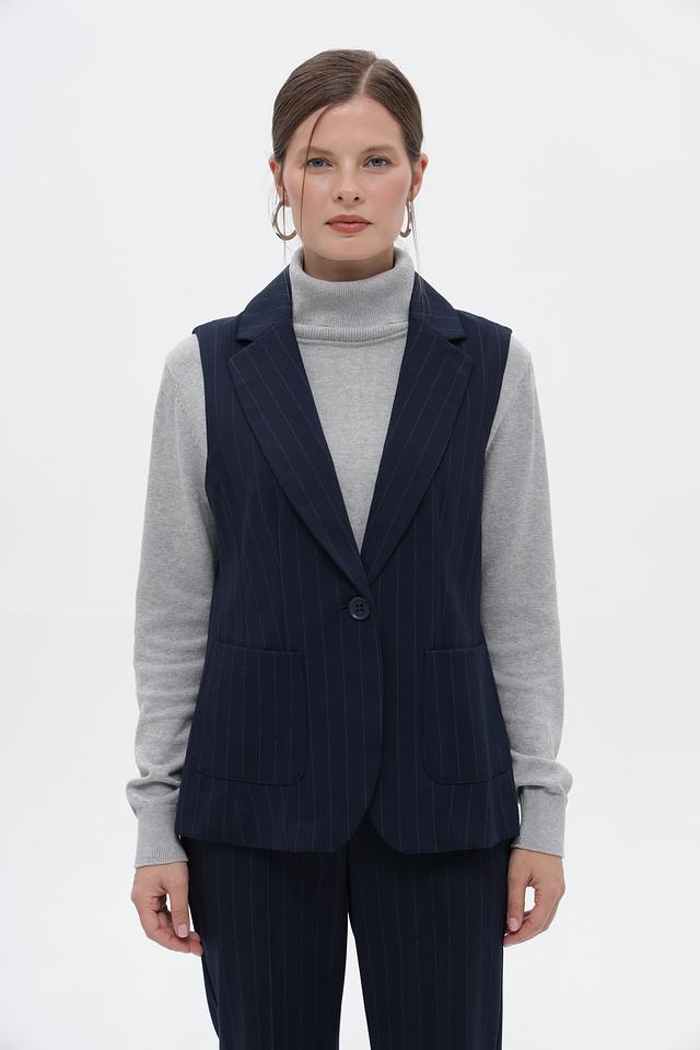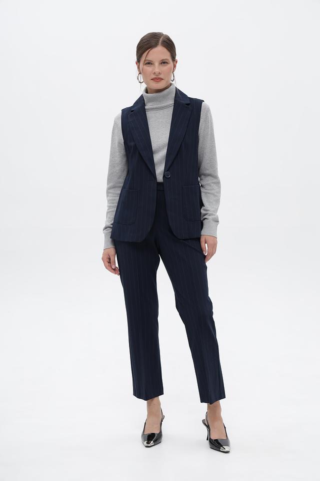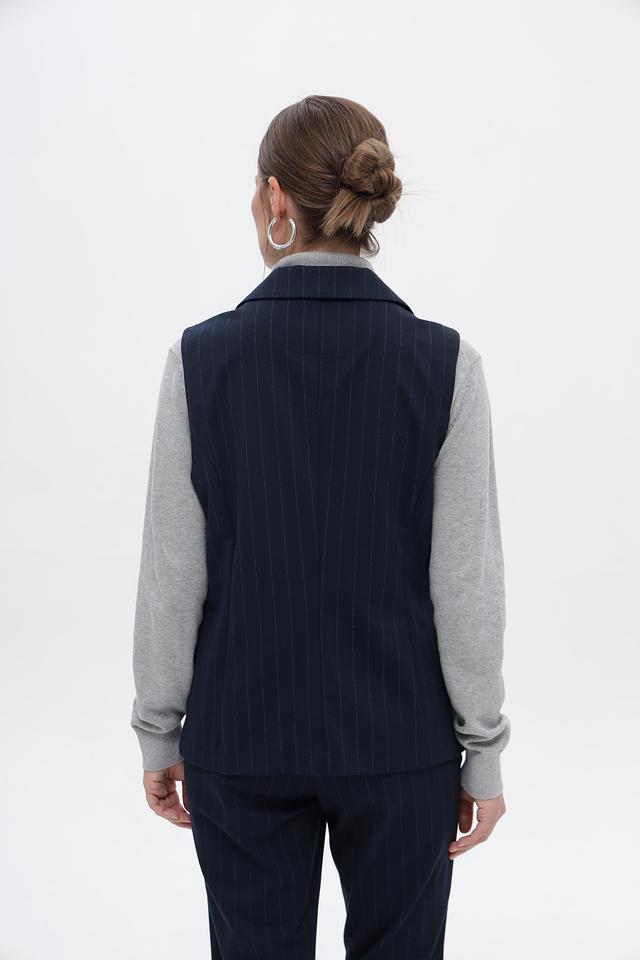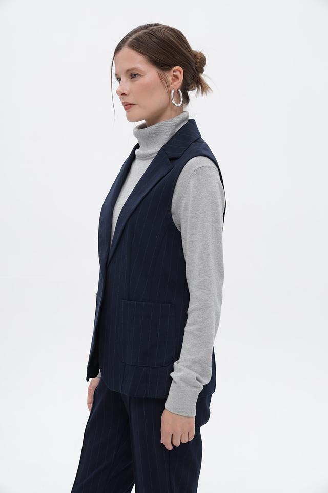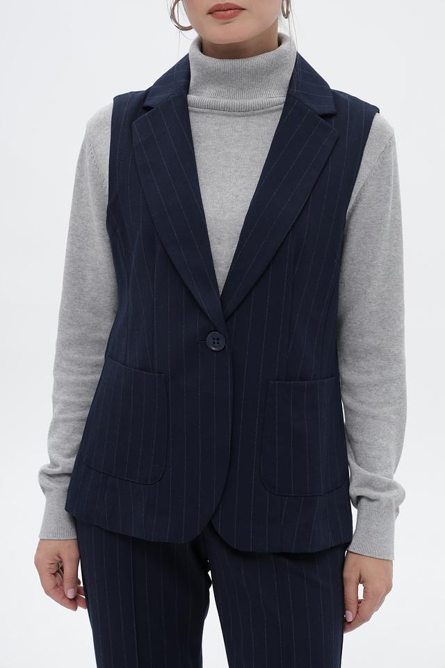 Классический женский жилет Bianca синего цвета, выполненный в тонкую полоску. Модель имеет лацканы, застежку на одну пуговицу и два функциональных кармана.