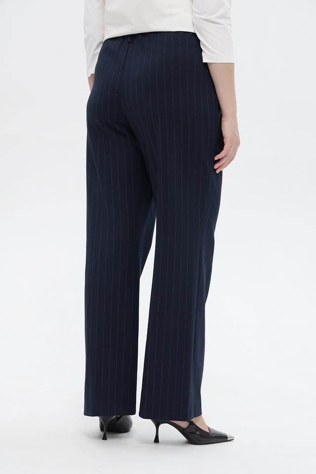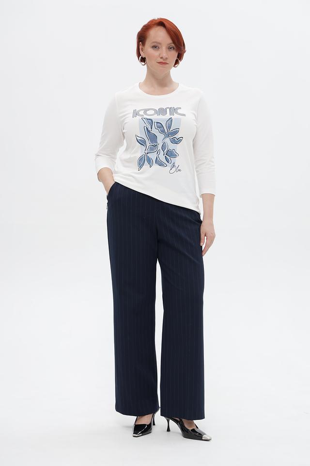 Брюки имеют прямой крой, высокую посадку и вертикальную полоску, визуально стройнящую фигуру. Застежка на молнию и пуговицу обеспечивает надежную фиксацию. Боковые и задние карманы добавляют функциональности.