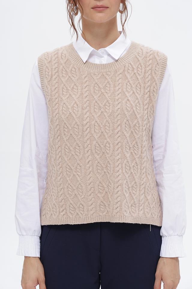 Жилет имеет бежевый цвет и украшен выразительным узором из кос, который придает ему особый шарм. Классический крой делает его универсальным и подходящим для различных стилей одежды.