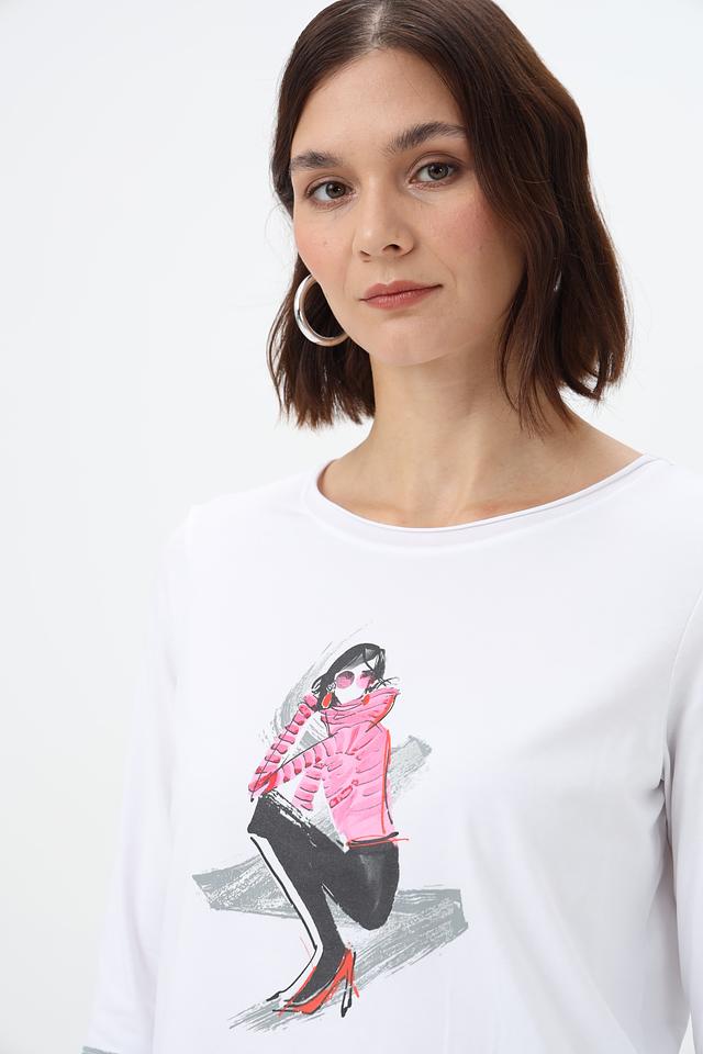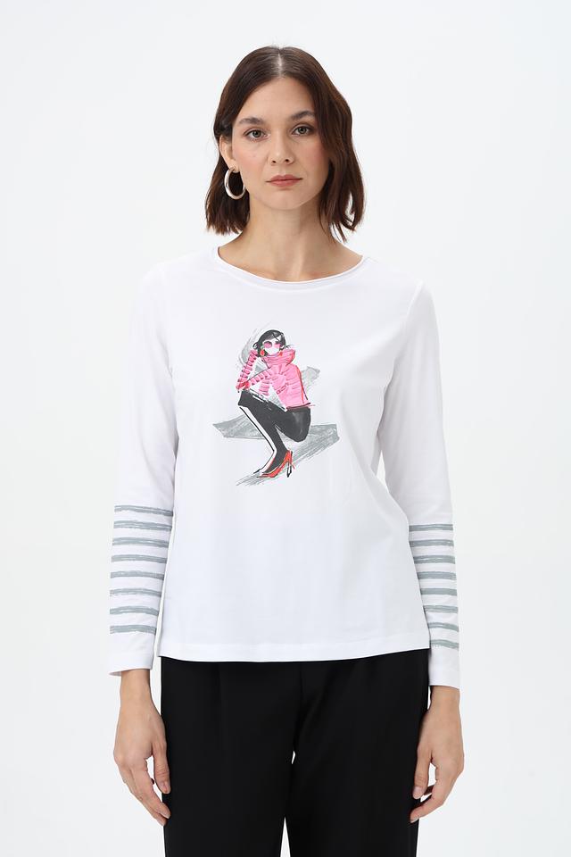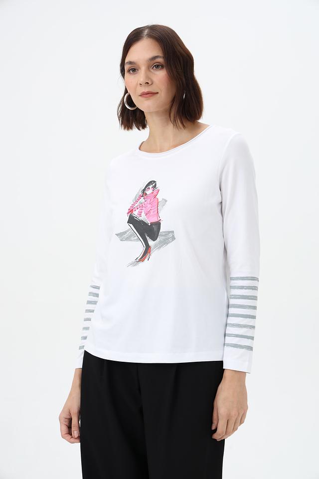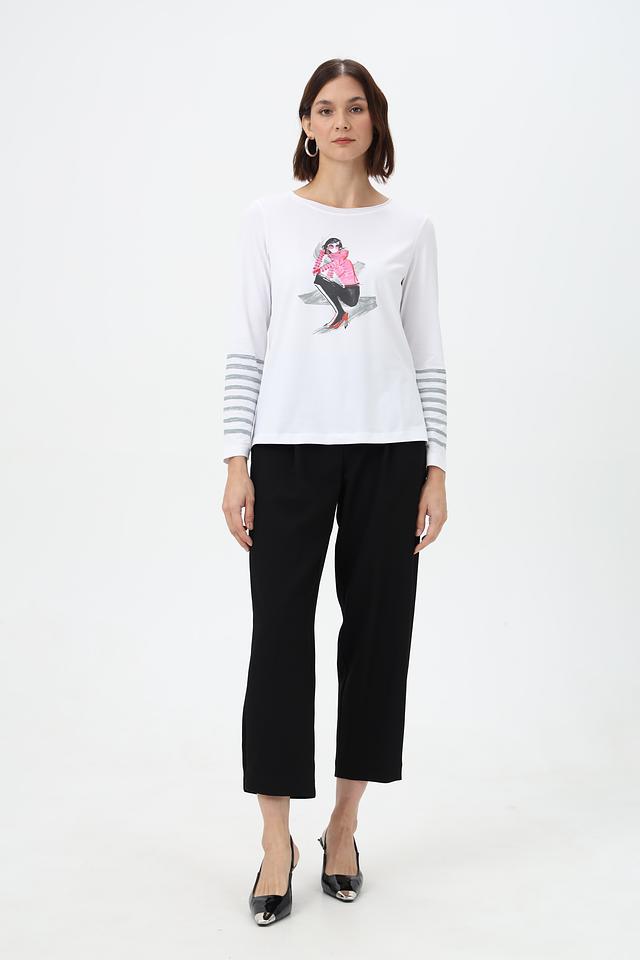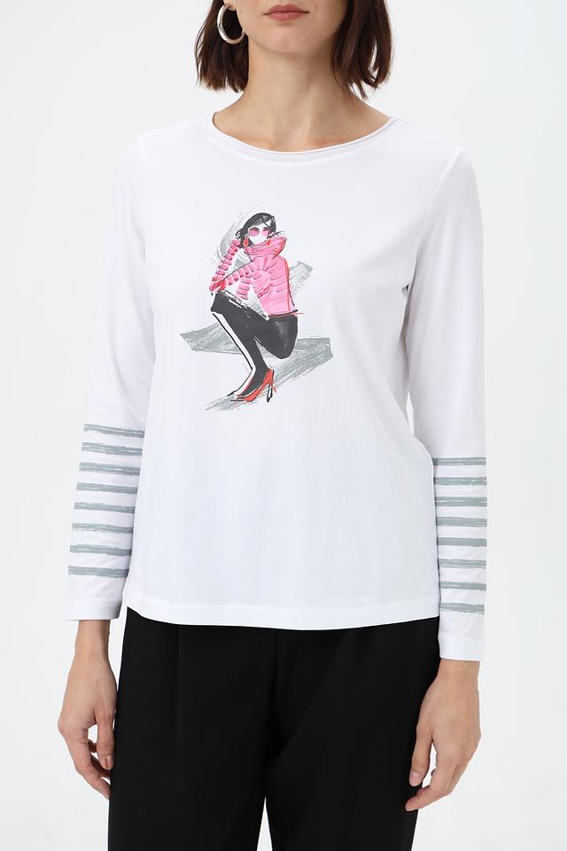 Модель имеет длинные рукава и круглый вырез горловины. Рукава украшены серыми полосками, которые придают блузе динамичный вид. На передней части блузы расположен яркий принт с изображением девушки в розовой куртке и чёрных брюках.
