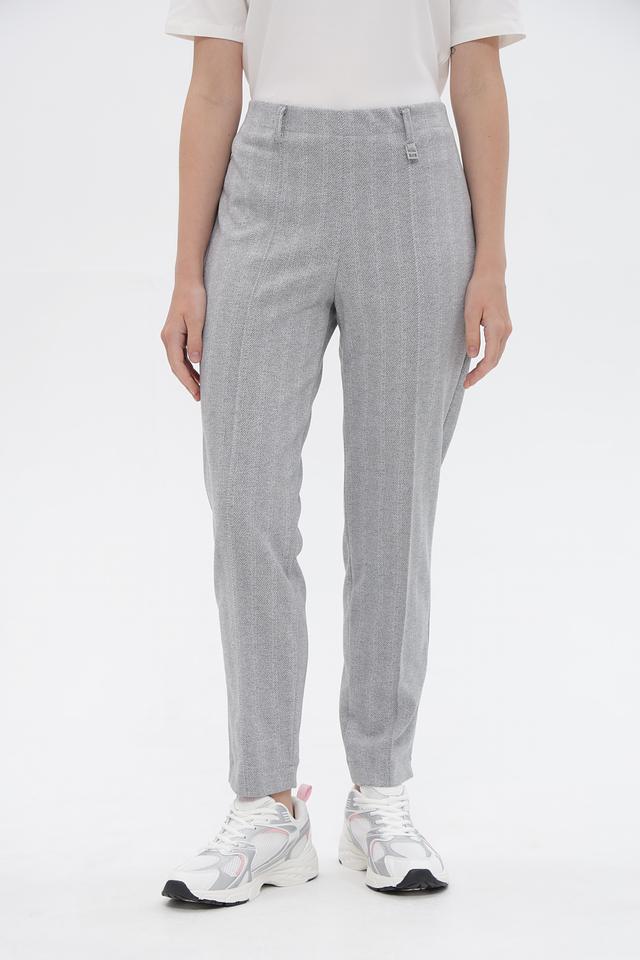 Брюки имеют высокую посадку и зауженный крой, что визуально удлиняет ноги и подчеркивает талию. Эластичный пояс обеспечивает комфортную посадку по фигуре, а стрелки добавляют образу элегантности и строгости.