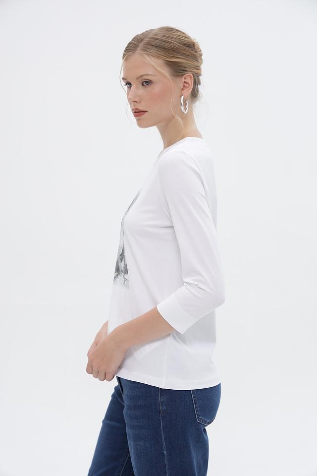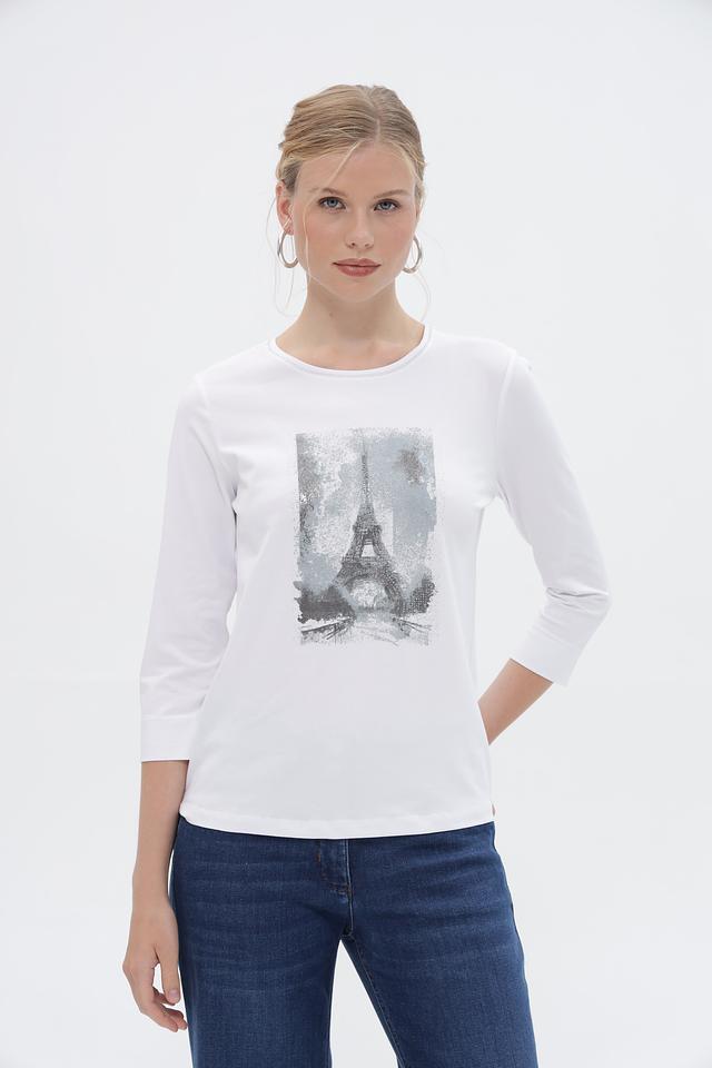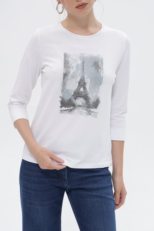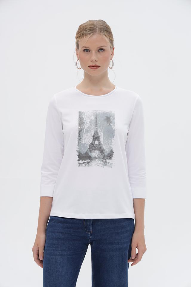 Лонгслив имеет классический крой с круглым вырезом горловины и рукавами длиной 3/4. Основным акцентом является стильный принт с изображением Эйфелевой башни, выполненный в оттенках серого, что придает изделию особую изысканность.