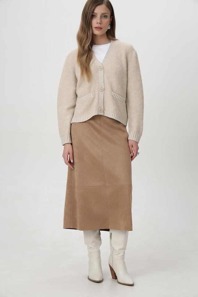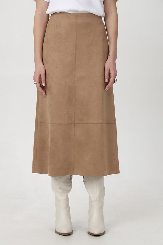 Модель имеет длину миди и приталенный силуэт, который подчеркивает фигуру. Юбка застегивается на скрытую молнию сзади. Текстура эко-замши придает изделию элегантный и изысканный вид.