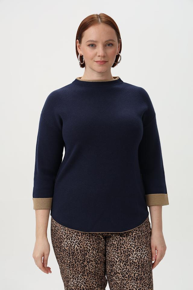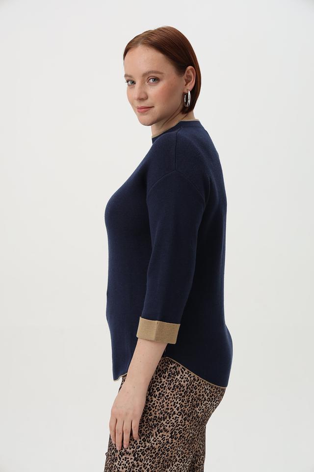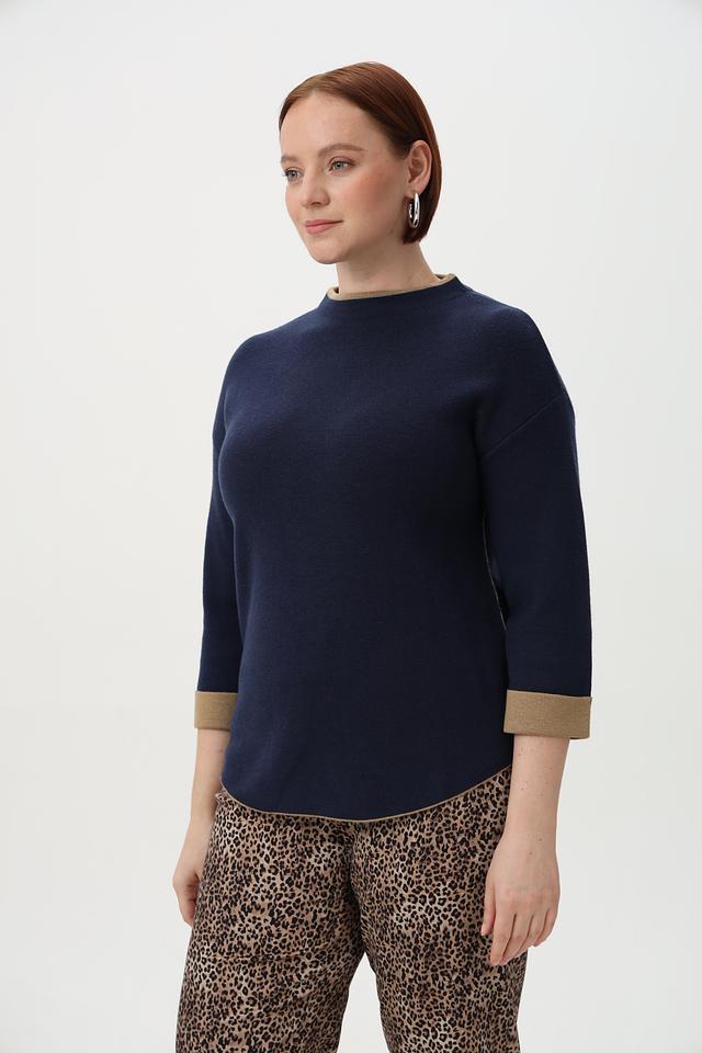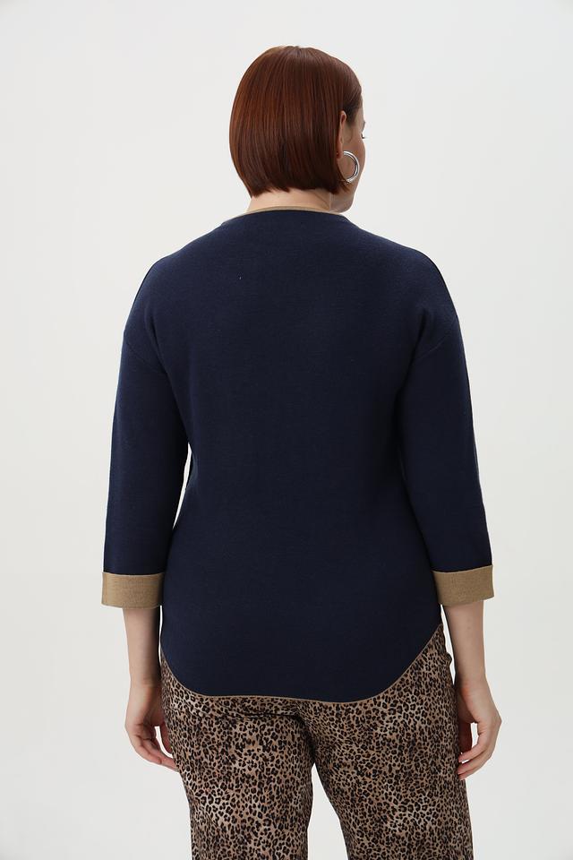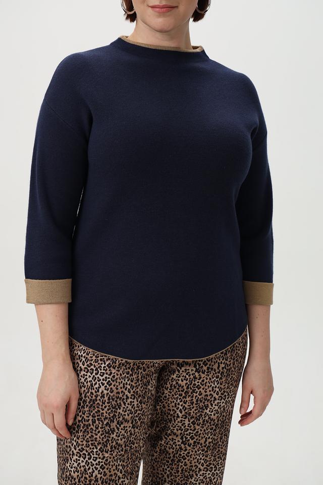 Основной цвет пуловера – глубокий тёмно-синий, который легко сочетается с различными элементами одежды. Отделка горловины и манжет выполнена в золотистом цвете, что придает изделию изысканность и оригинальность.