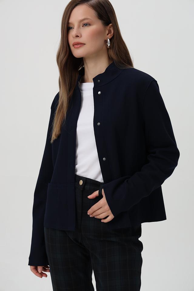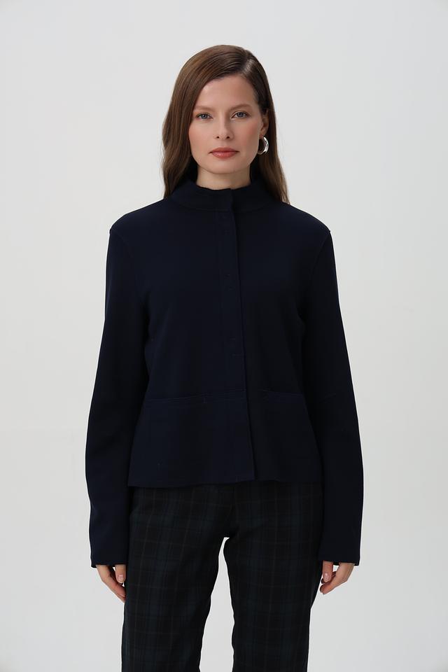 Жакет имеет приталенный силуэт, который подчеркивает фигуру, воротник-стойку и застегивается на пуговицы по всей длине.
