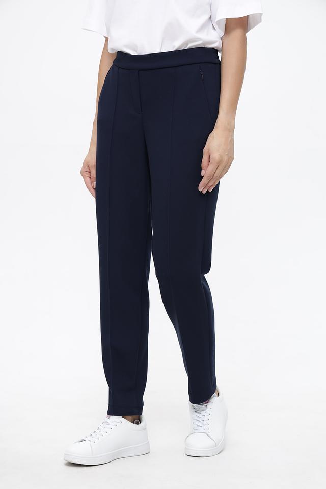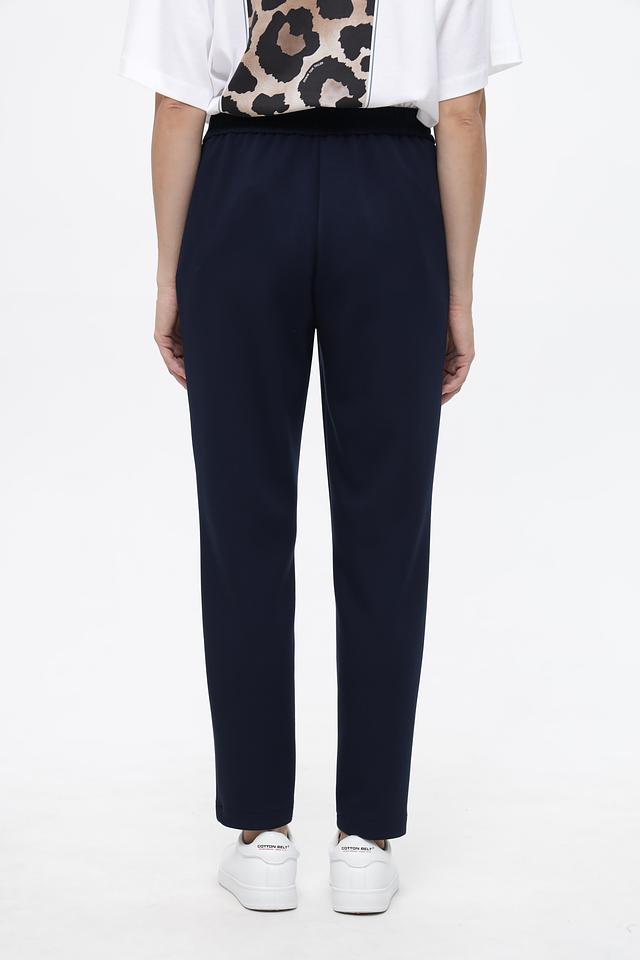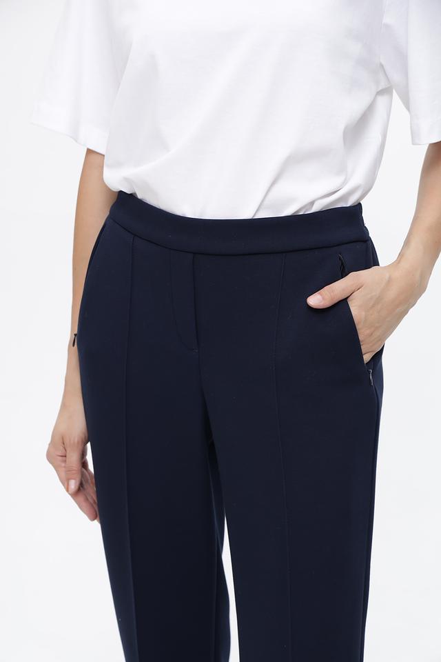 Брюки имеют прямой крой, пояс на эластичной резинке и аккуратные боковые карманы. Наличие стрелок придает им более строгий и деловой вид.