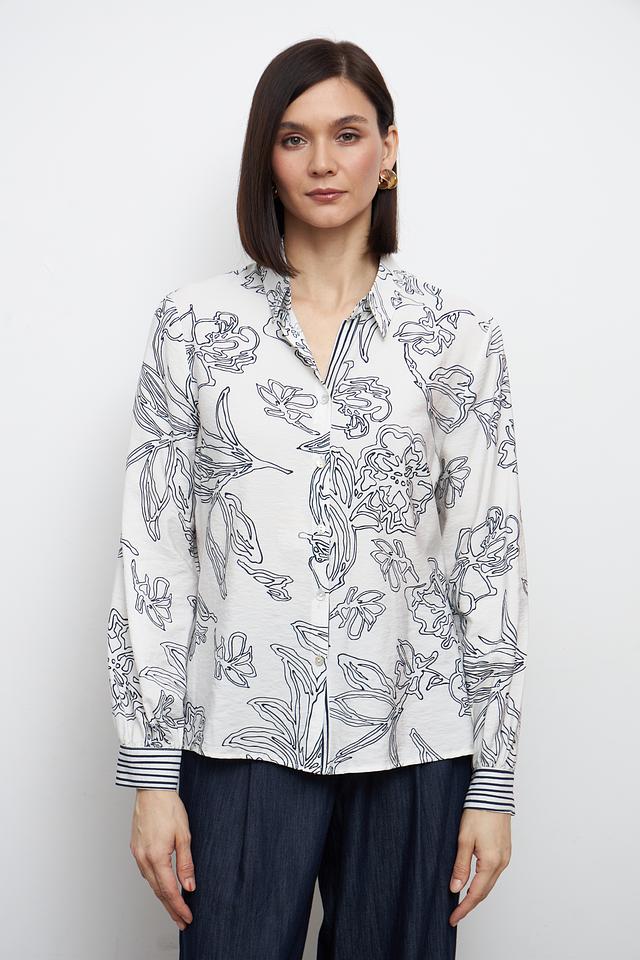 Модель имеет классический крой с V-образным вырезом и длинными рукавами. Манжеты рукавов оформлены полоской в тон принту. Блуза застегивается на пуговицы в тон ткани.