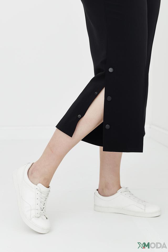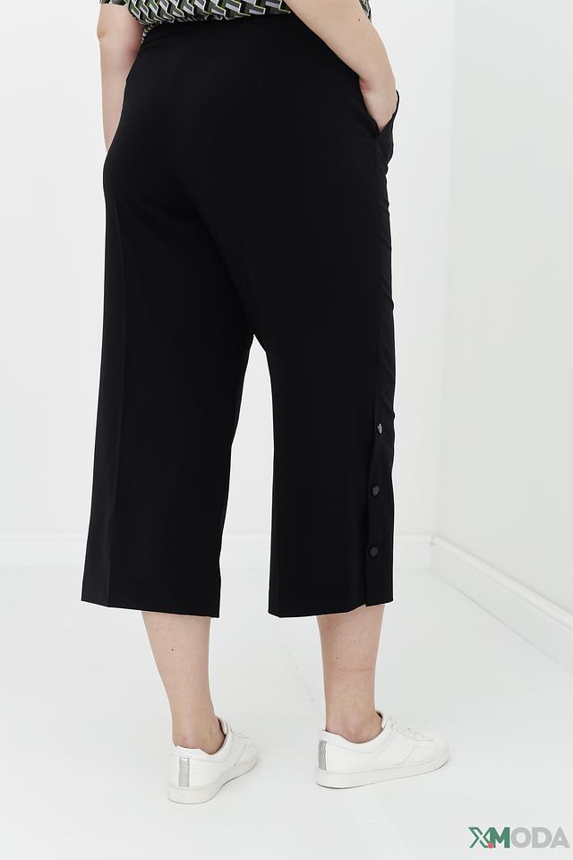 Особенностью данной модели является оригинальный дизайн с декоративными пуговицами, расположенными вдоль боковой части брюк. Кюлоты имеют удобную посадку на талии и свободный крой, что делает их идеальным выбором для повседневной носки.