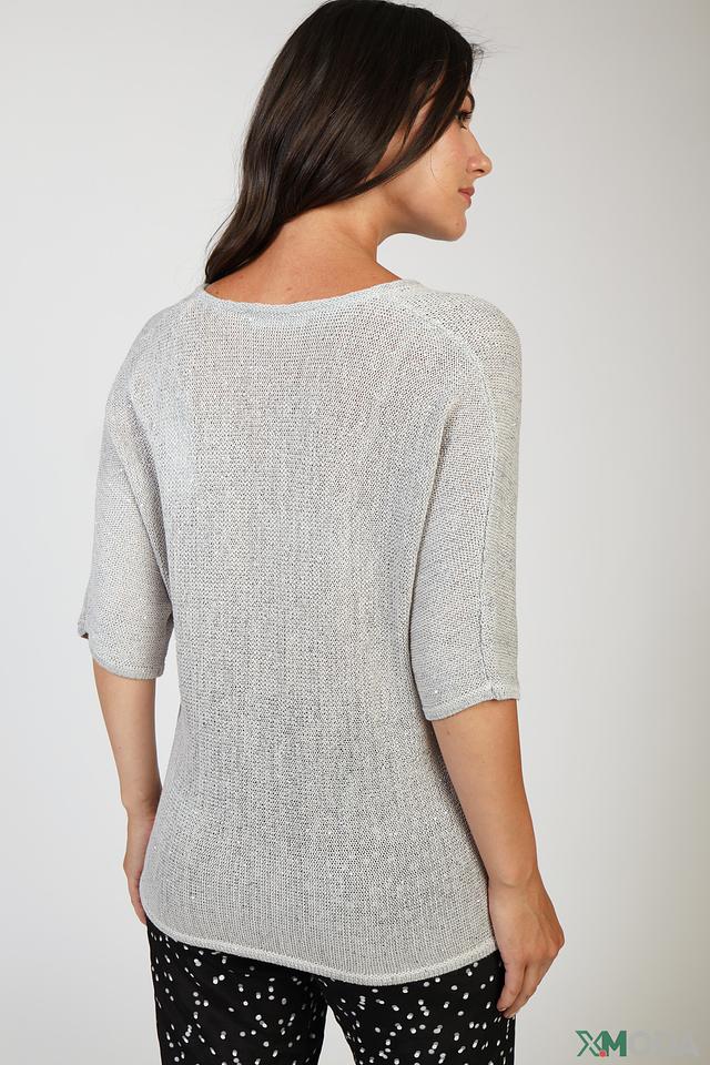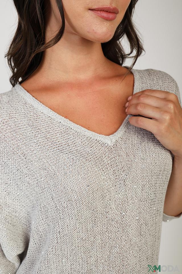 Этот пуловер от Bianca выполнен в светло-сером цвете и имеет V-образный вырез, который визуально удлиняет шею. Рукава модели – три четверти, что делает ее универсальной для любого времени года.