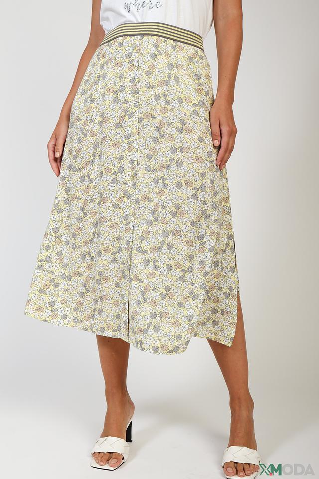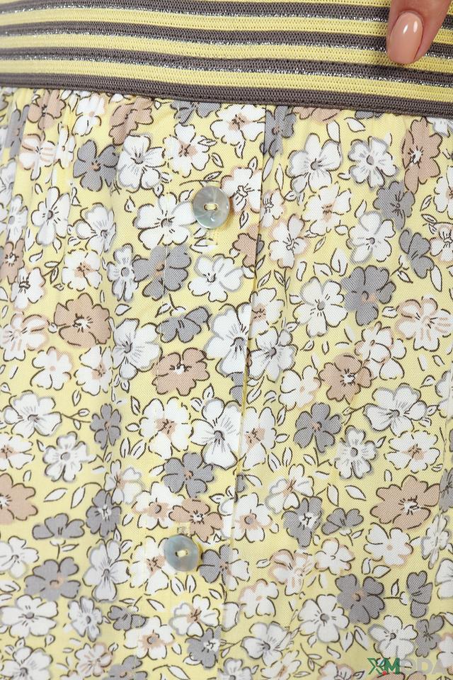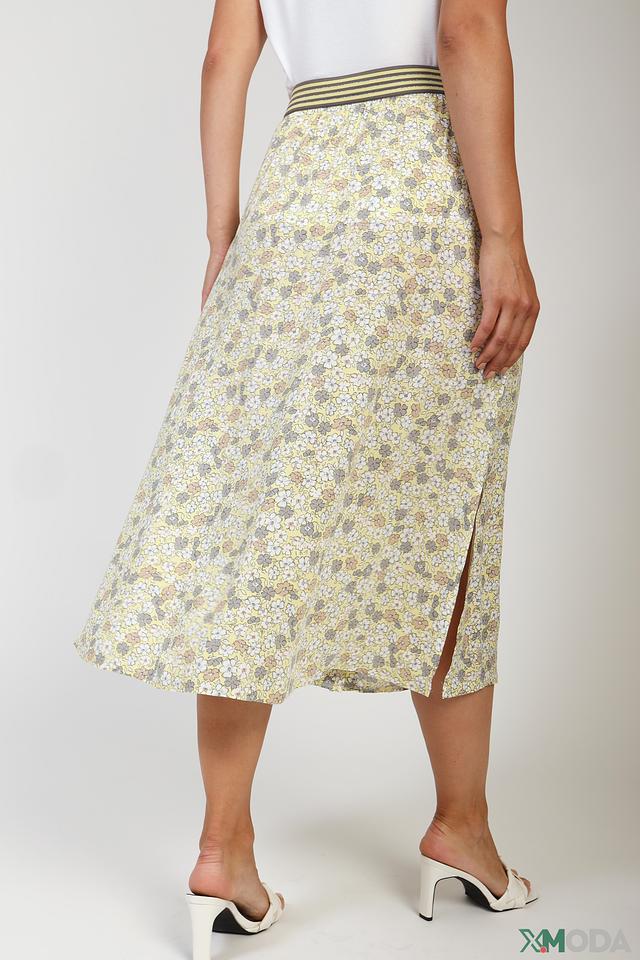 Юбка имеет лёгкий, струящийся силуэт и украшена нежным цветочным принтом на светло-жёлтом фоне. Эластичный пояс обеспечивает удобную посадку по фигуре, а небольшой разрез спереди добавляет образу лёгкую игривость.