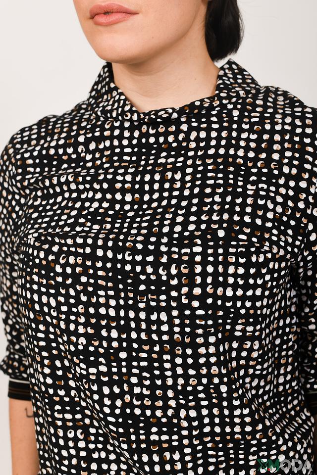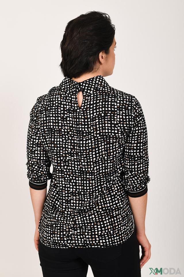 Блуза Bianca чёрно-белого цвета с оригинальным принтом станет стильным дополнением к вашему гардеробу. Модель выполнена из мягкой вискозы, обеспечивающей комфорт в носке, и имеет воротник-стойку. Состав: вискоза 100%