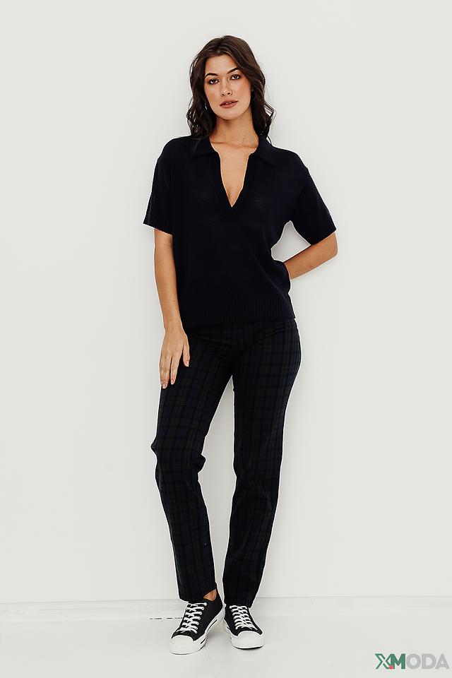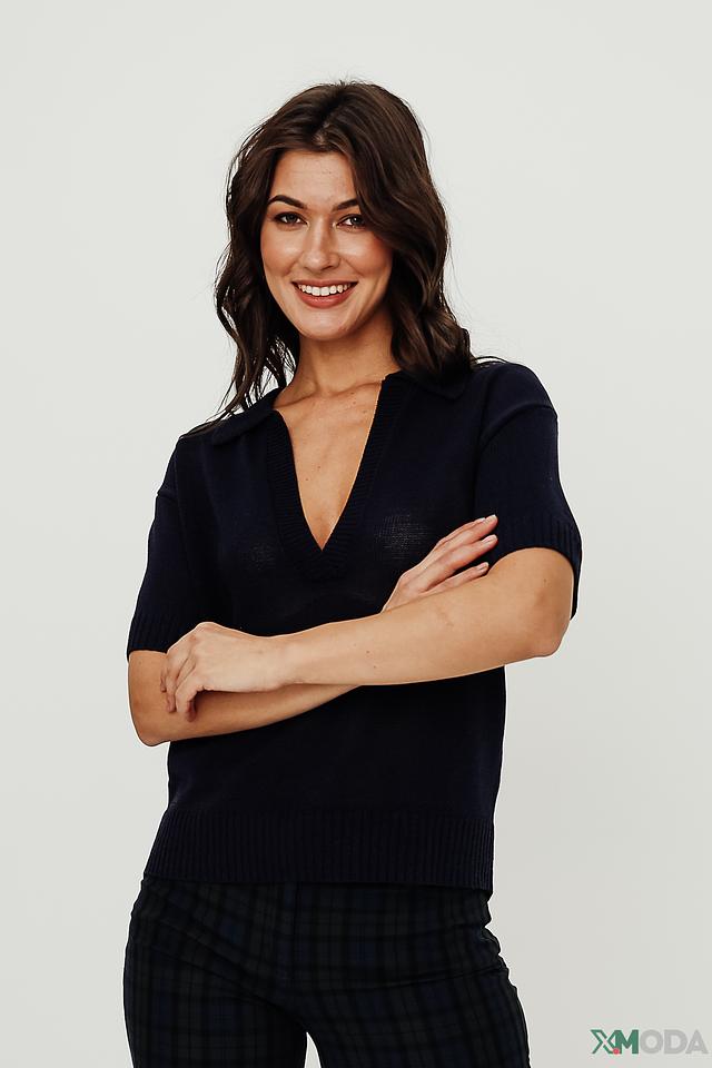 Стильный пуловер Bianca тёмно-синего цвета с короткими рукавами и V-образным вырезом. Модель выполнена из мягкого трикотажа с воротником-стойкой, что придает ей элегантный вид. Состав: вискоза 65%, полиамид 35%
