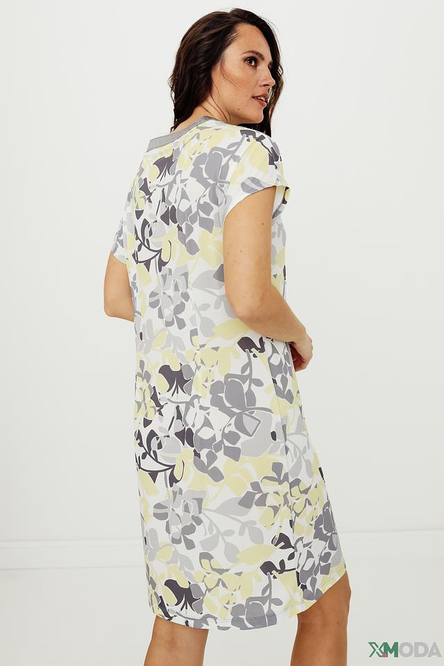 Платье имеет прямой силуэт, короткие рукава и V-образный вырез горловины, который дополнен небольшой планкой на пуговицах. Принт состоит из абстрактных цветочных мотивов в оттенках серого, жёлтого и белого, создавая свежий и романтичный образ.