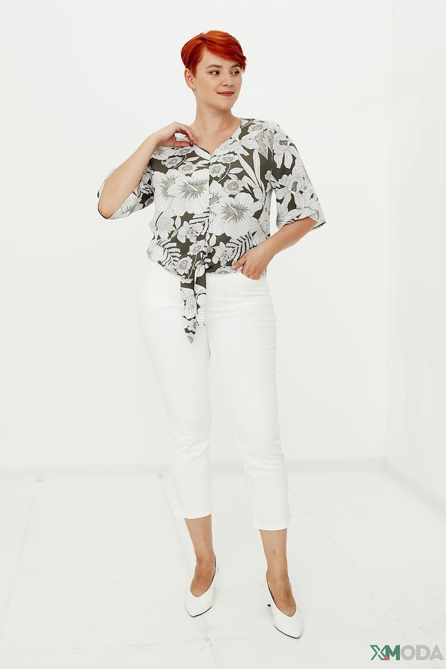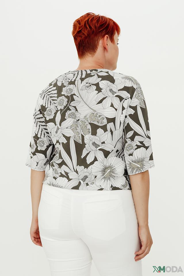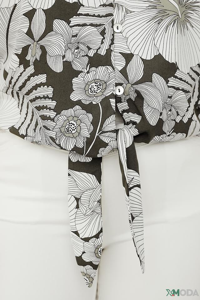 Блуза имеет оливковый фон, украшенный ярким и детализированным цветочным принтом в белых и серых тонах. V-образный вырез горловины и короткие рукава придают модели лёгкость и воздушность.