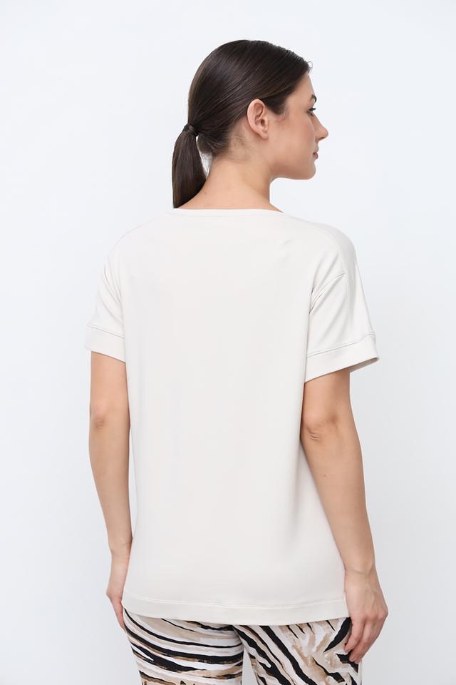 Бежевая футболка Bianca из мягкого хлопка с модальным волокном и принтом "SUN SHINE". Обладает свободным кроем и короткими рукавами, идеально подходит для создания повседневных образов. Состав: хлопок 65%, модал 30%, эластан 5%