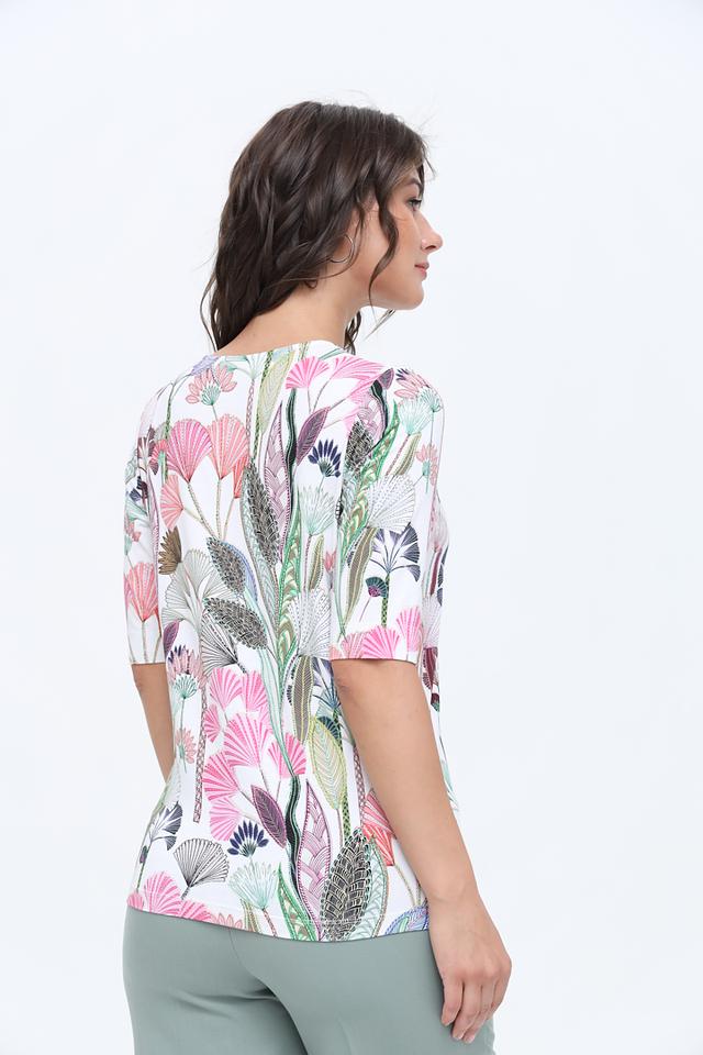 Блуза имеет прямой крой и короткий рукав, что делает ее универсальной для различных образов. Основной цвет блузы – белый, а яркий цветочный принт добавляет ей женственности и оригинальности.