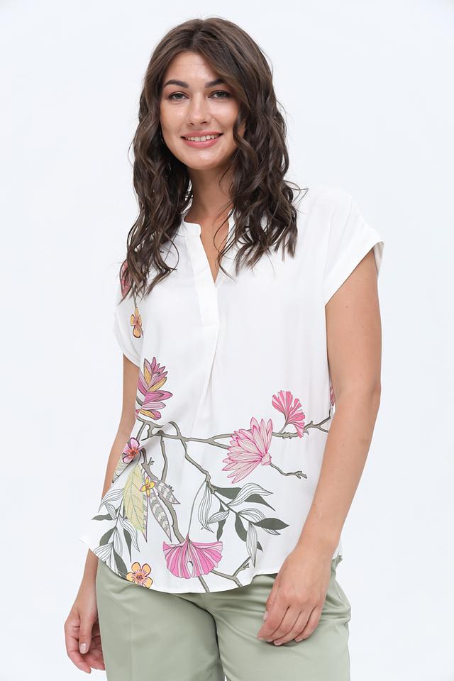 Основной цвет блузы – белый, который служит отличным фоном для яркого и красочного цветочного принта. Рисунок выполнен в нежных розовых, жёлтых и зелёных тонах, создавая романтичное и лёгкое настроение.
