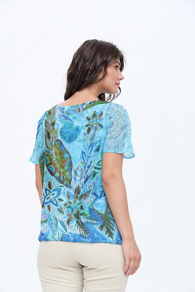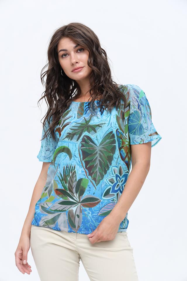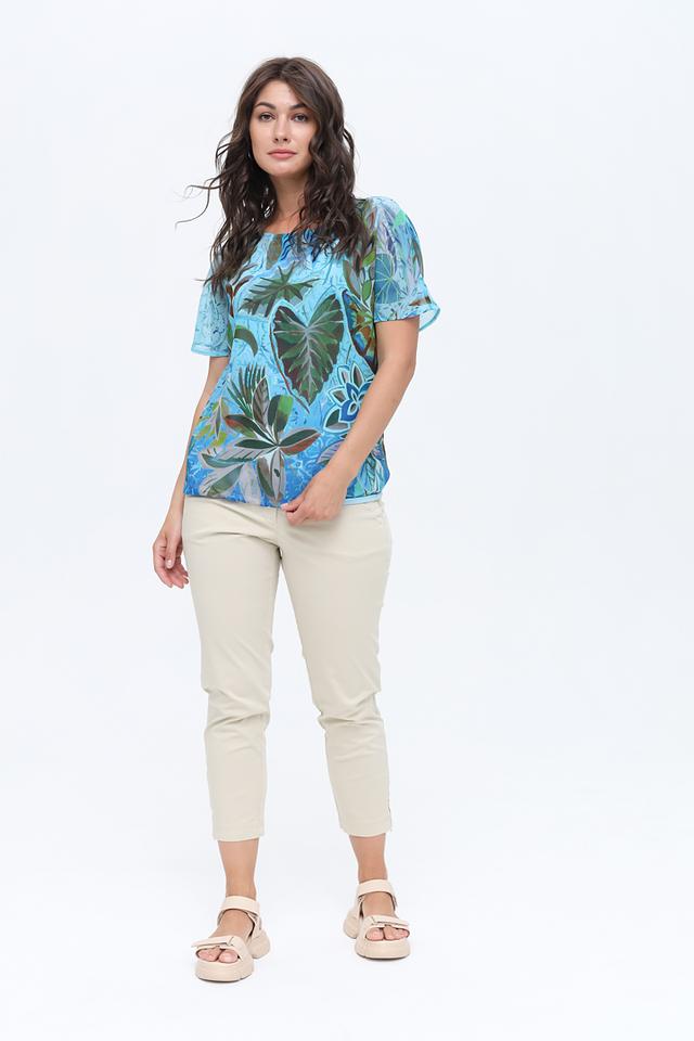Блуза Bianca голубого цвета с ярким тропическим принтом станет отличным дополнением к вашему гардеробу. Изготовлена из лёгкого полиэстера, обеспечивающего комфорт в жаркую погоду. Модель с короткими рукавами и округлым вырезом. Состав: полиэстер 100%
