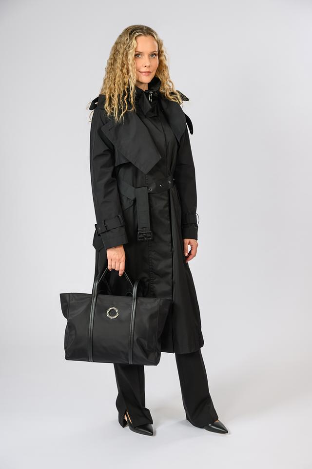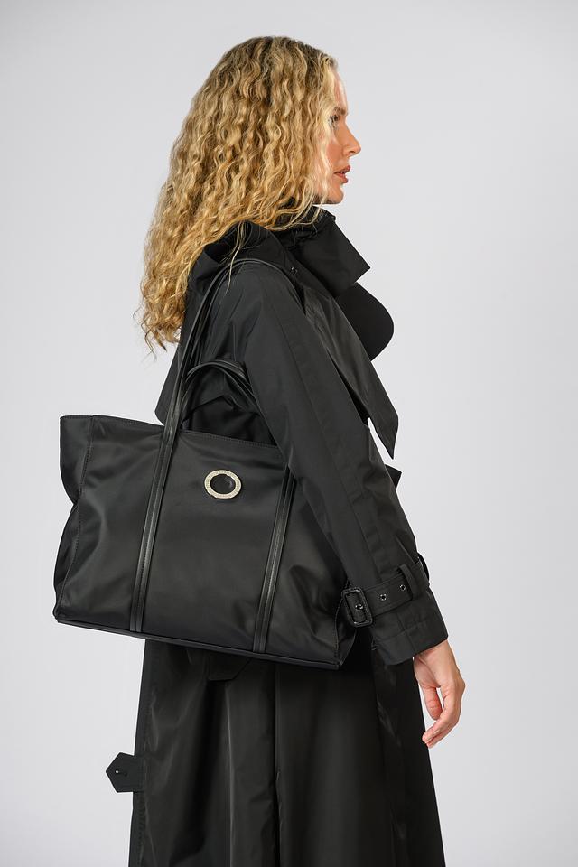 Чёрный цвет делает сумку универсальной, позволяя сочетать её с различными образами. Фирменный логотип в виде металлической окружности с названием бренда добавляет элегантности и подчеркивает статусность аксессуара.