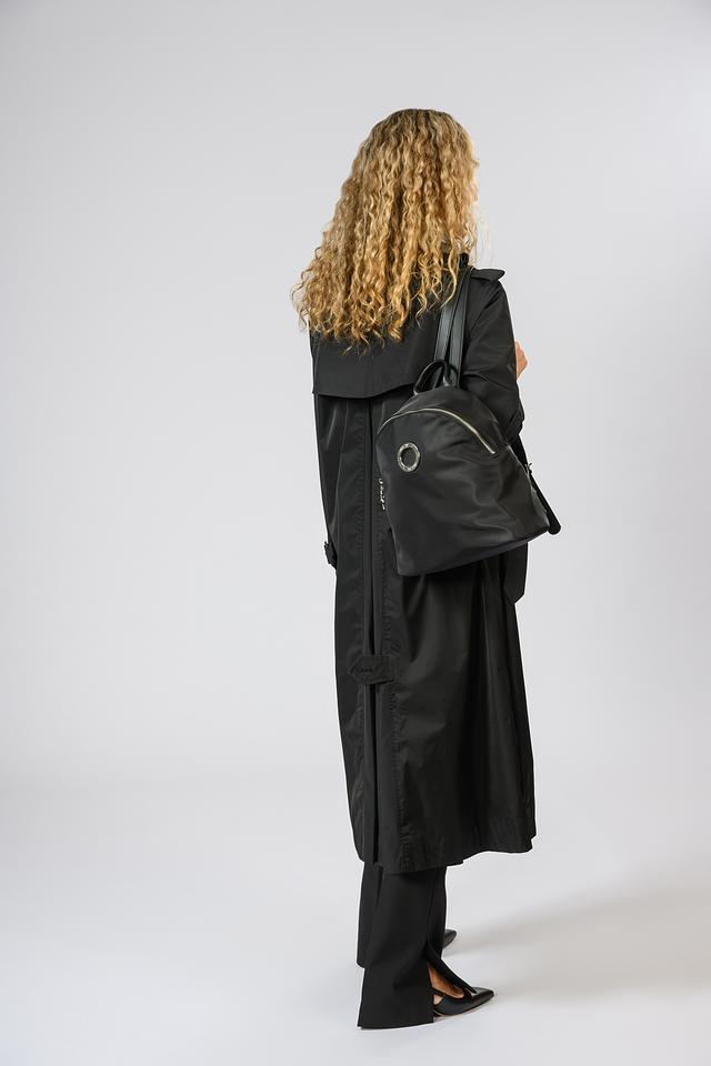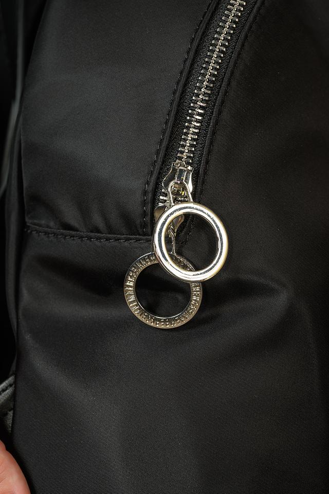 Чёрный цвет делает его универсальным дополнением к любому образу. На передней панели расположен круглый логотип бренда, выполненный в тон, что придает рюкзаку узнаваемый вид.