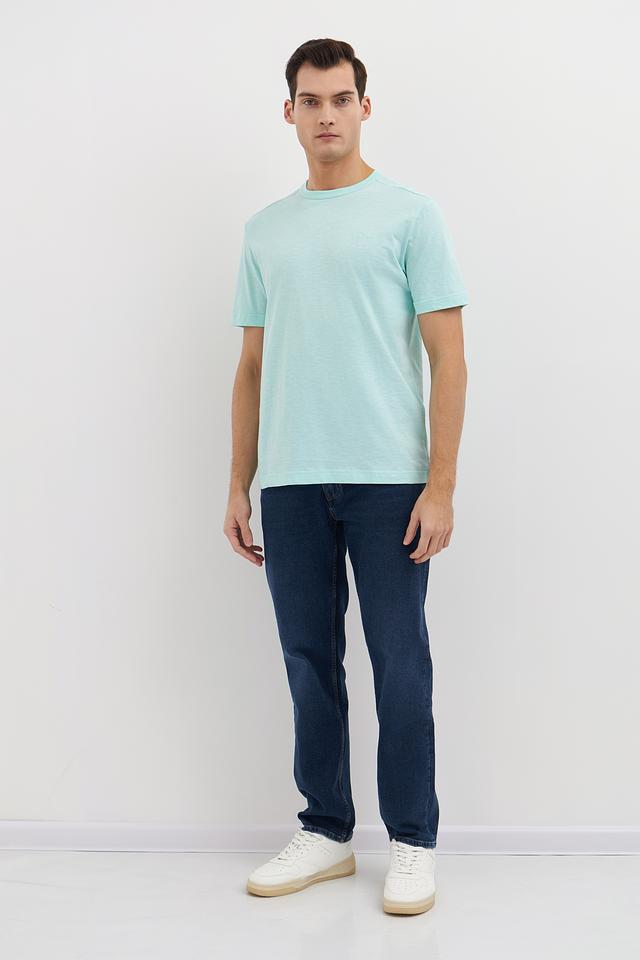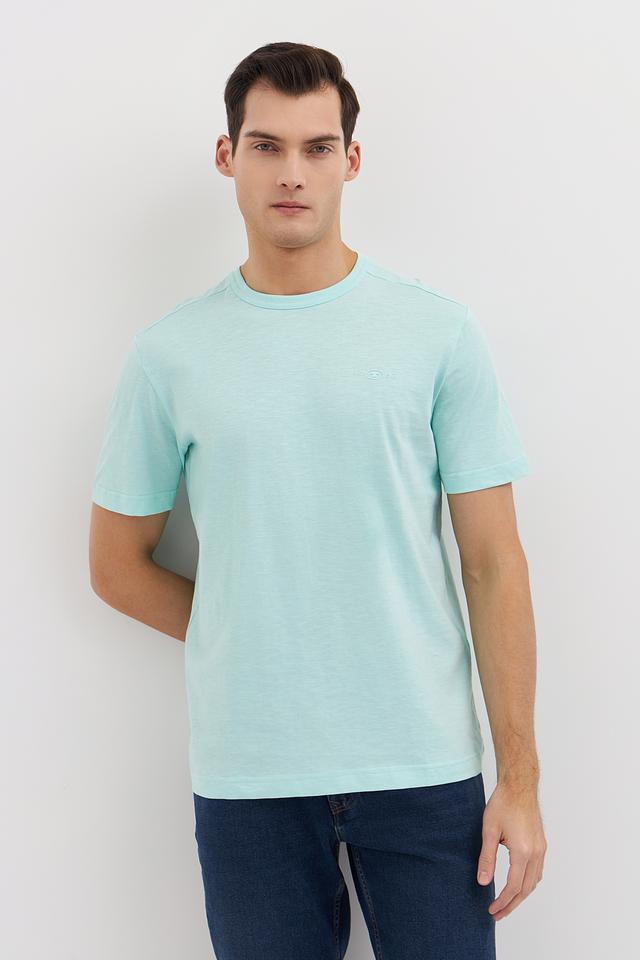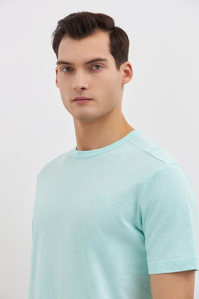 Цвет футболки – нежный мятный, который легко сочетается с различными элементами гардероба. На груди расположена небольшая вышивка с логотипом бренда, добавляющая изысканности. Круглый вырез горловины и короткие рукава делают эту футболку идеальной для теплой погоды.