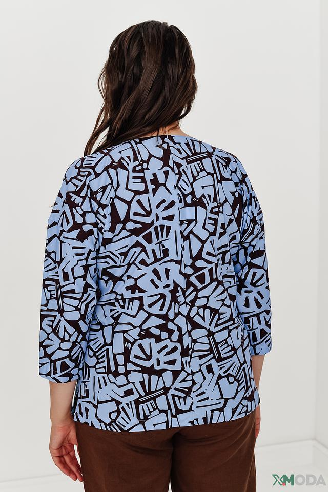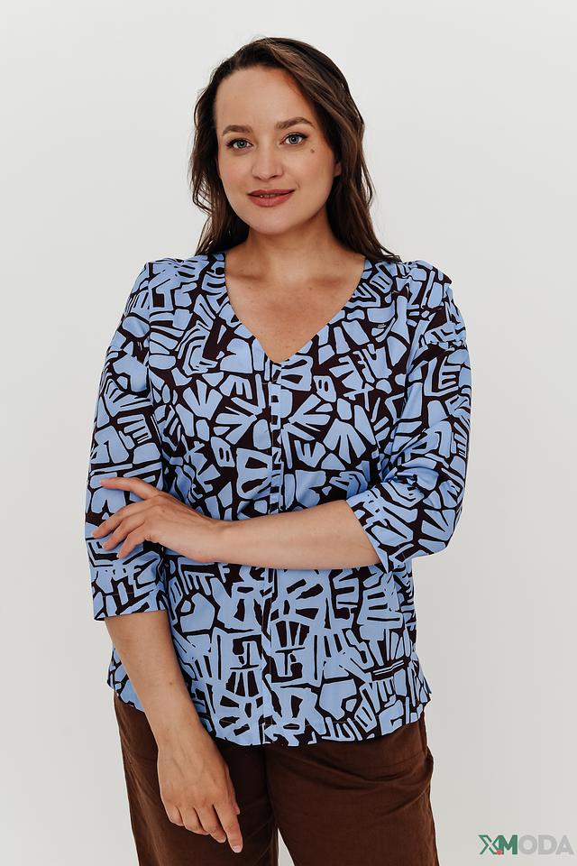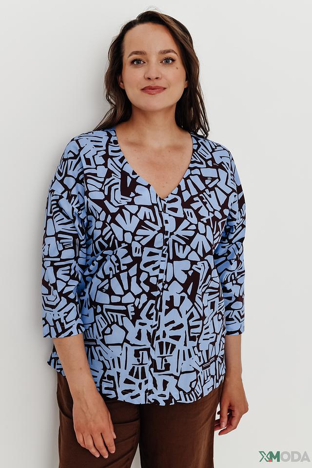 Блуза имеет свободный крой, который не сковывает движений, и V-образный вырез, который визуально удлиняет шею. Главная особенность этой модели – яркий и необычный принт в голубых и черных тонах, который добавит изюминку вашему образу.