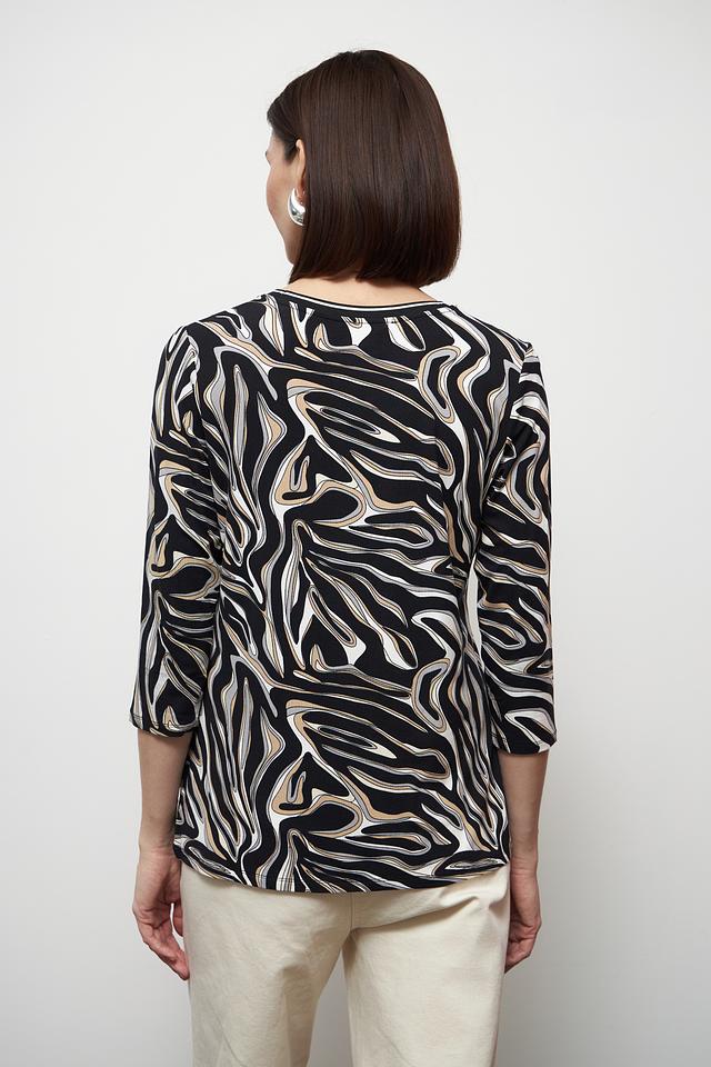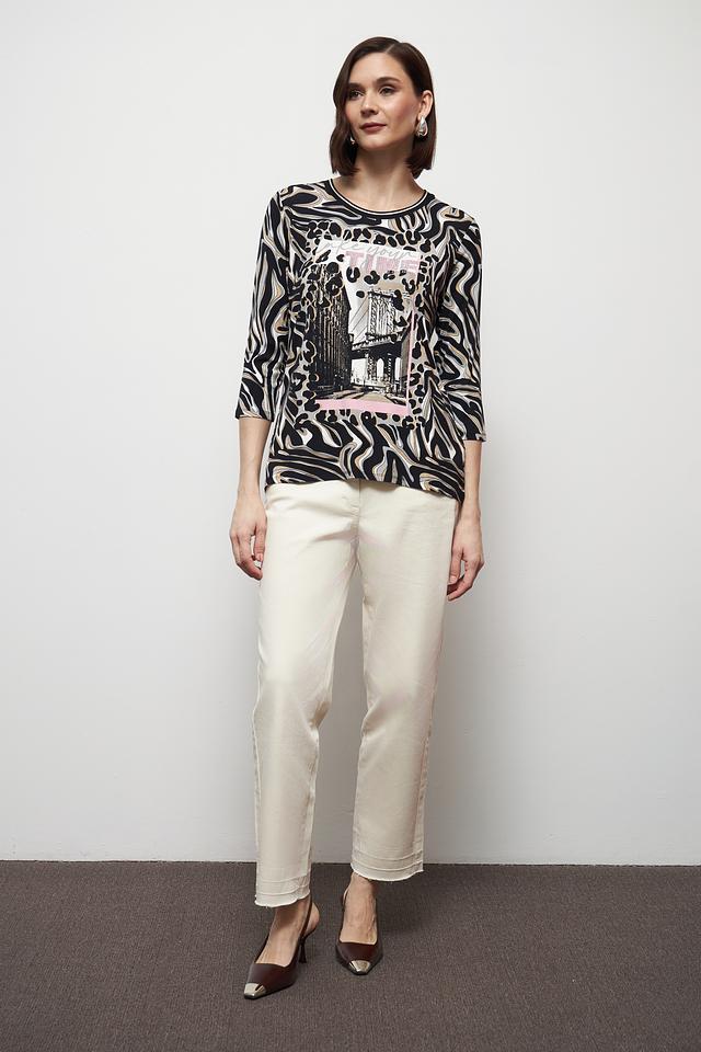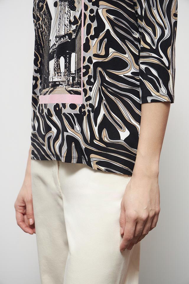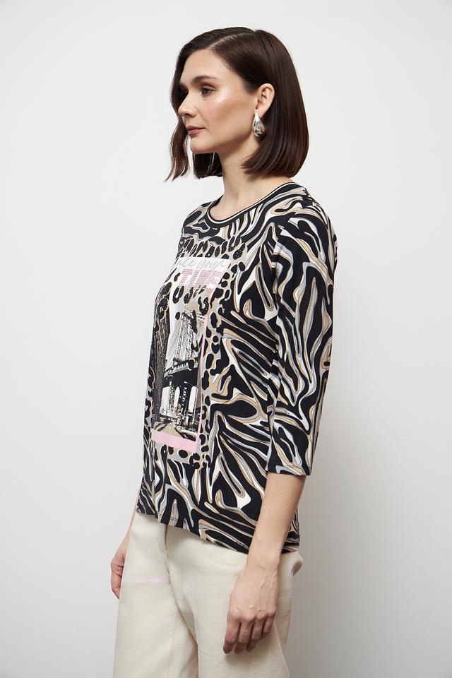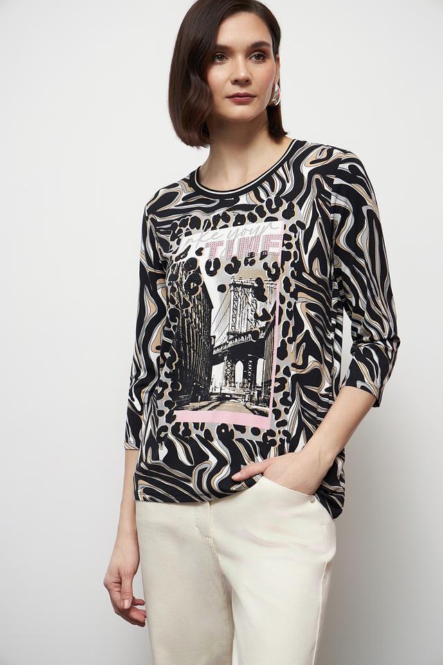 Блуза Betty Barclay чёрно-белого цвета с ярким принтом в виде городского пейзажа. Модель выполнена из мягкой вискозы с добавлением эластана, что обеспечивает комфорт и удобство в носке. Прекрасный выбор для создания стильного и оригинального образа. Состав: вискоза 95%, эластан 5%