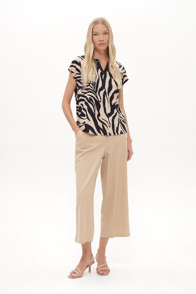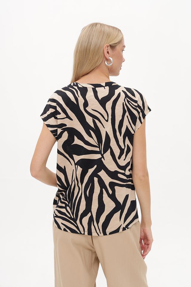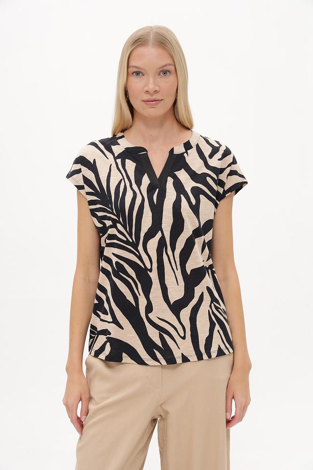 Эта блузка от Betty Barclay – отличный выбор для создания элегантного и современного образа. Блузка выполнена в оригинальном дизайне с принтом, имитирующим шкуру зебры, сочетающим в себе черный и бежевый цвета.