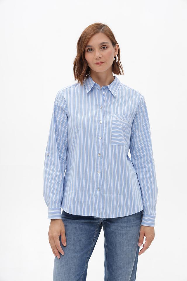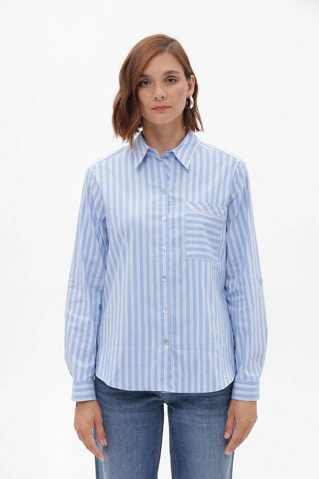 Блузка имеет прямой, слегка приталенный силуэт, который выгодно подчеркивает фигуру. Длинные рукава с манжетами на пуговицах позволяют регулировать длину и создавать различные варианты образа. На левой стороне груди расположена накладная карман, который добавляет функциональности и акцентирует внимание.