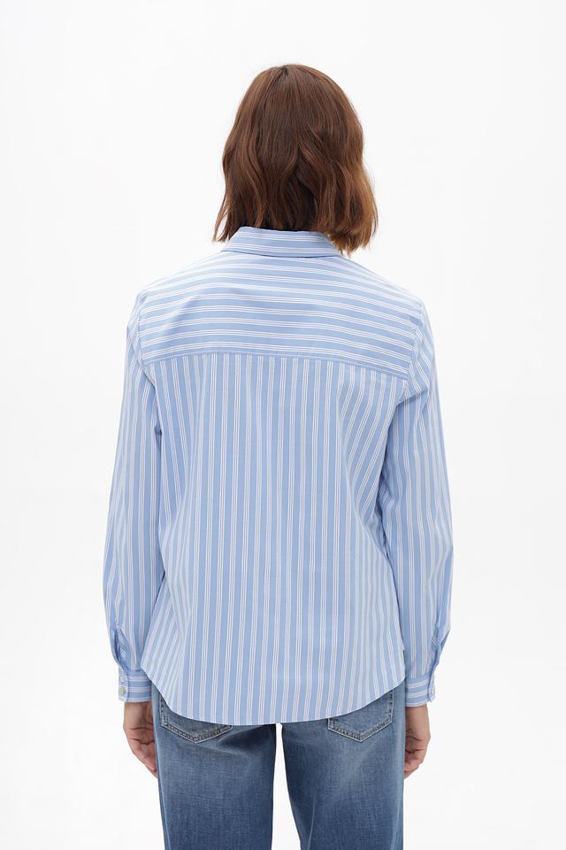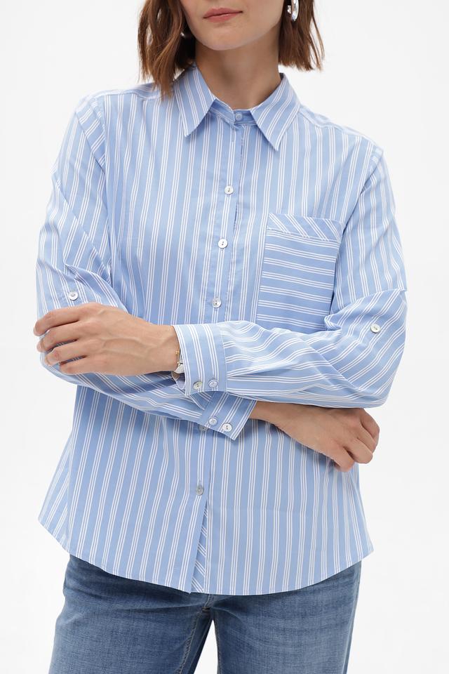 Женская блузка Bianca голубого цвета в белоснежную полоску — идеальный выбор для создания стильного и комфортного образа. Модель выполнена из хлопкового трикотажа с добавлением полиамида и эластана, что обеспечивает удобную посадку и лёгкость в уходе. Состав: хлопок 74%, полиамид 22%, эластан 4%