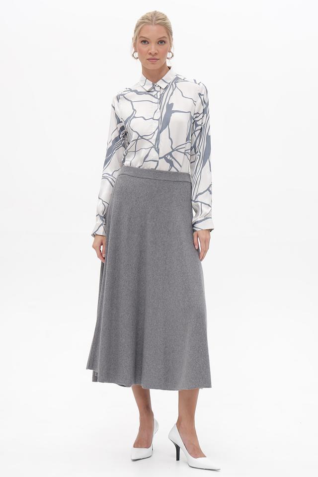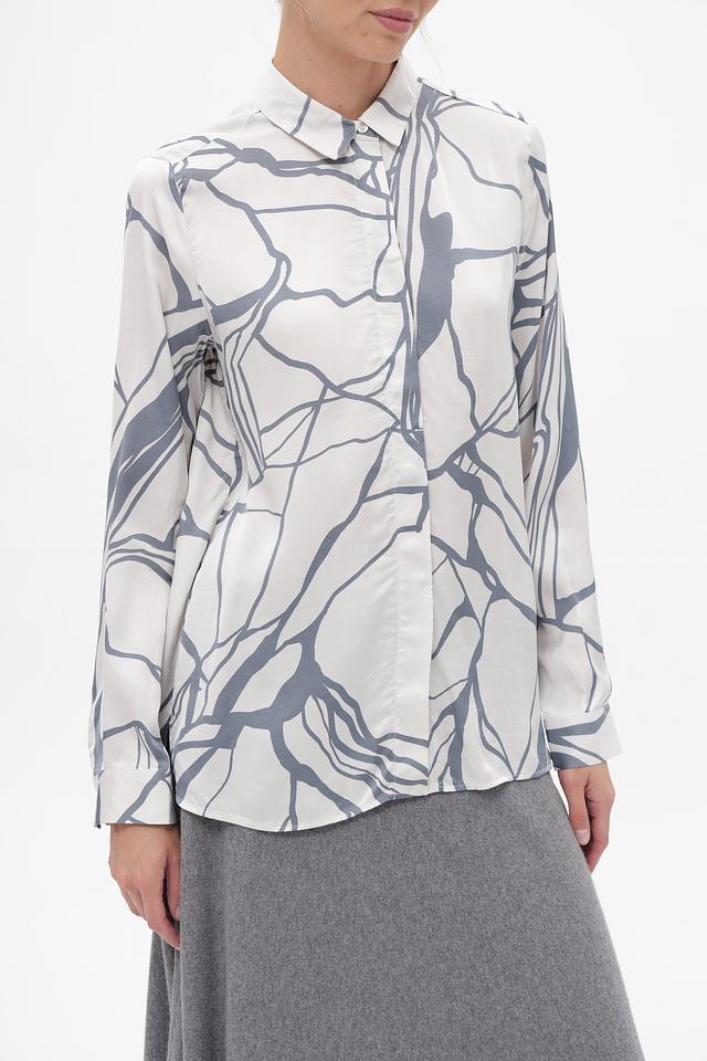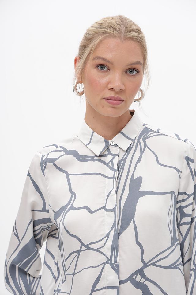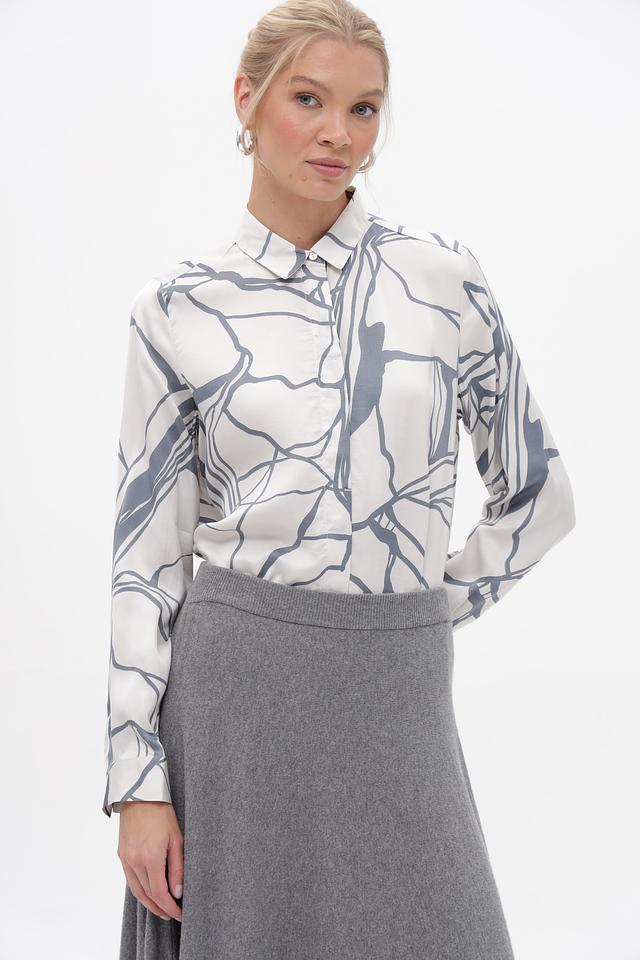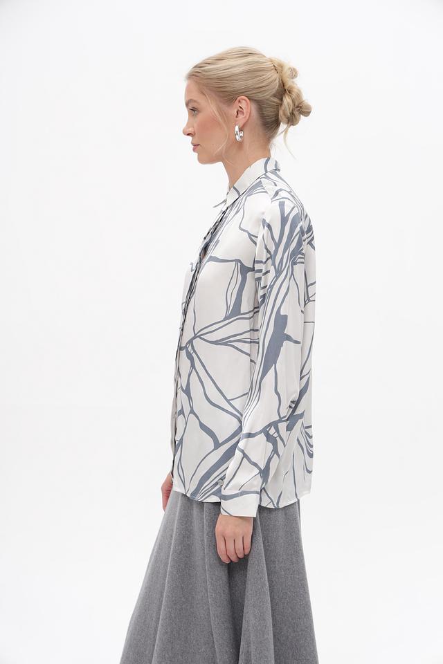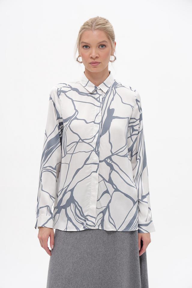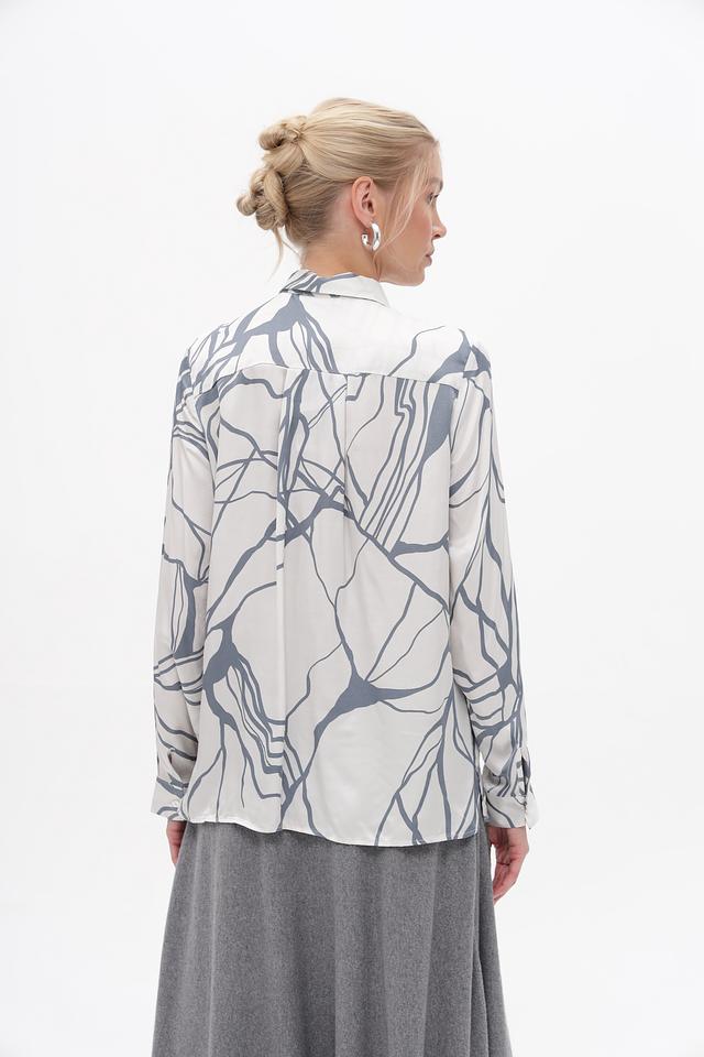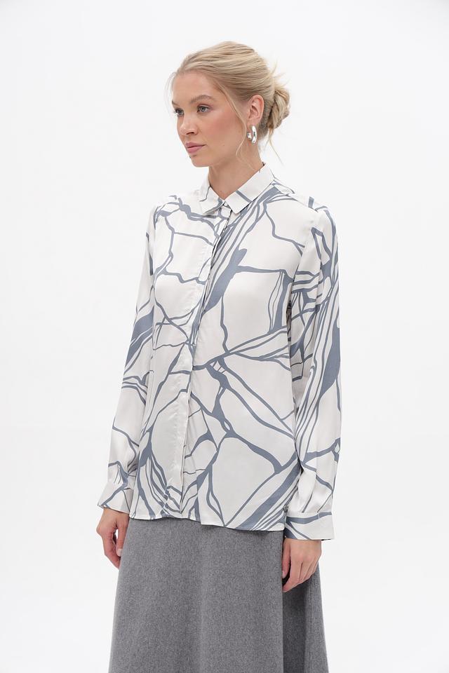 Особенностью данной модели является оригинальный абстрактный рисунок, выполненный в светло-серых и белых тонах. Такой принт добавит образу изысканности и индивидуальности. Блузка идеально подойдет для создания как повседневных, так и более формальных образов.