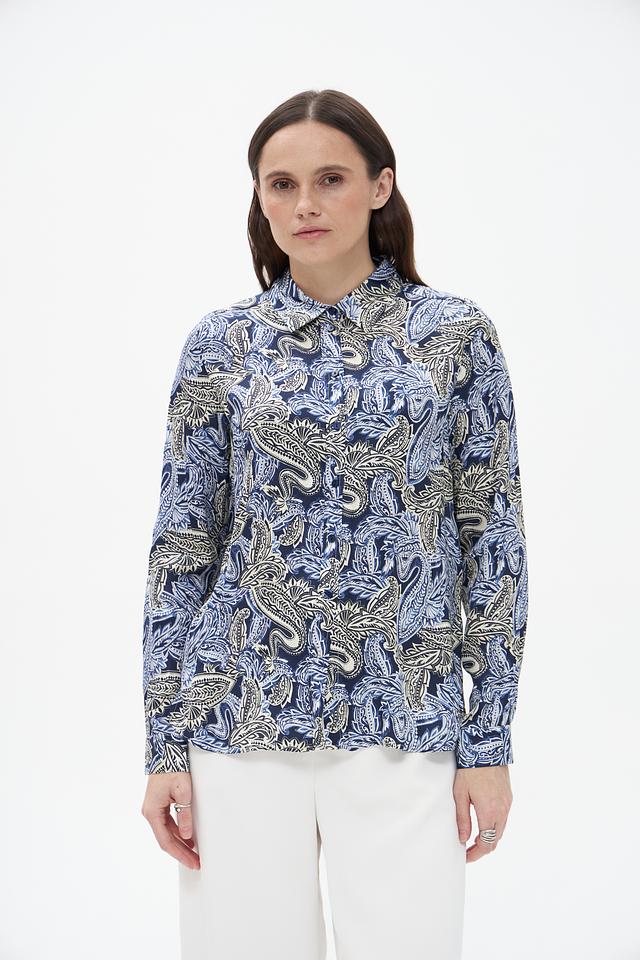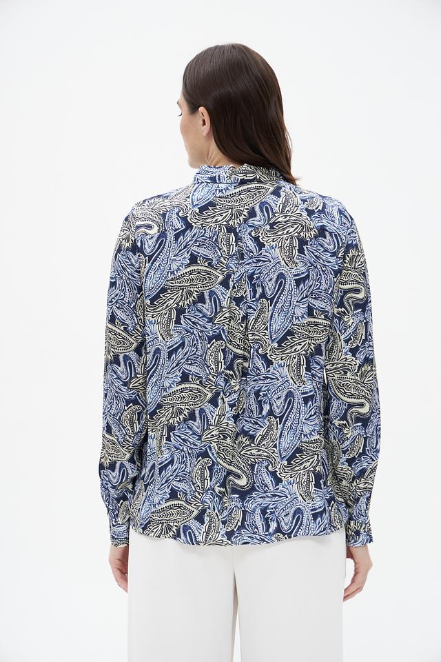 Блузка имеет классический силуэт с длинными рукавами и воротником-стойкой. Главной особенностью модели является яркий и запоминающийся узор пейсли, выполненный в синих, бежевых и голубых тонах. Этот принт добавляет блузке изысканности и оригинальности.